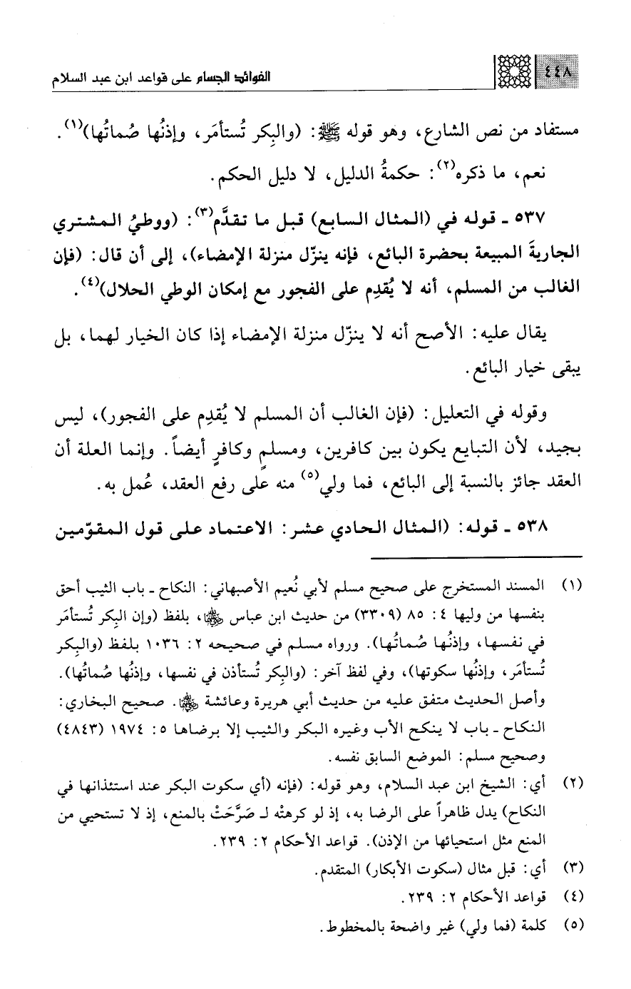 537 - قوله في (المثال السابع) قبل ما تقدَّم (¬3): (ووطيُ المشتري الجاريةَ المبيعة بحضرة البائع، فإنه ينزّل منزلة الإمضاء)، إلى أن قال: (فإن الغالب من المسلم، أنه لا يُقدِم على الفجور مع إمكان الوطي الحلال) (¬4).