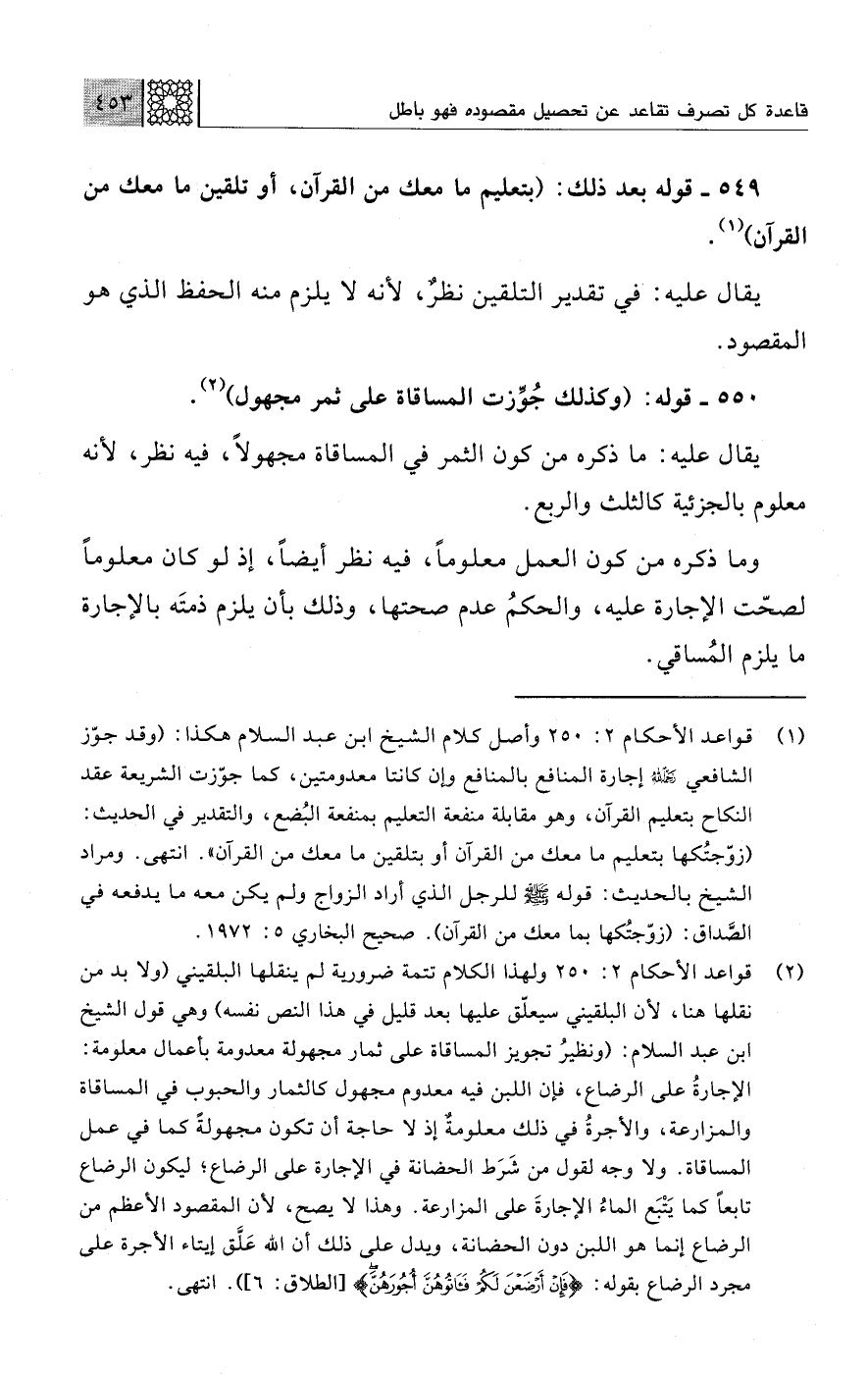 (¬1) قواعد الأحكام 2: 250 وأصل كلام الشيخ ابن عبد السلام هكذا: (وقد جوّز الشافعي -رحمه الله- إجارة المنافع بالمنافع وإن كانتا معدومتين، كما جوّزت الشريعة عقد النكاح بتعليم القرآن، وهو مقابلة منفعة التعليم بمنفعة البُضع، والتقدير في الحديث: "زوّجتُكها بتعليم ما معك من القرآن أو بتلقين ما معك من القرآن". انتهى. ومراد الشيخ بالحديث: قوله - صلى الله عليه وسلم - للرجل الذي أراد الزواج ولم يكن معه ما يدفعه في الصَّداق: (زوّجتُكها بما معك من القرآن). صحيح البخاري 5: 1972.