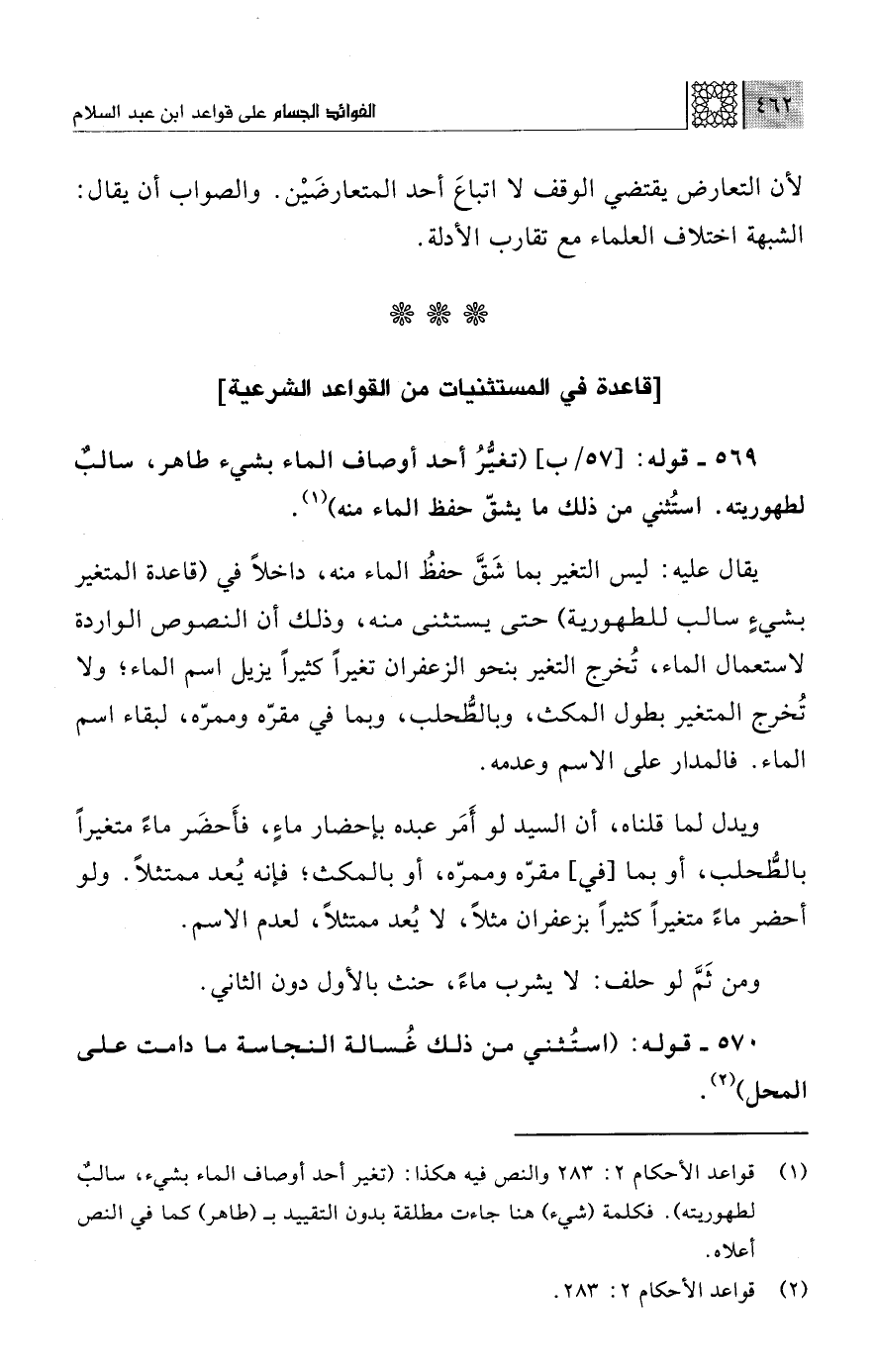 (¬1) قواعد الأحكام 2: 283 والنص فيه هكذا: (تغير أحد أوصاف الماء بشيء، سالبٌ لطهوريته). فكلمة (شيء) هنا جاءت مطلقة بدون التقييد بـ (طاهر) كما في النص أعلاه.