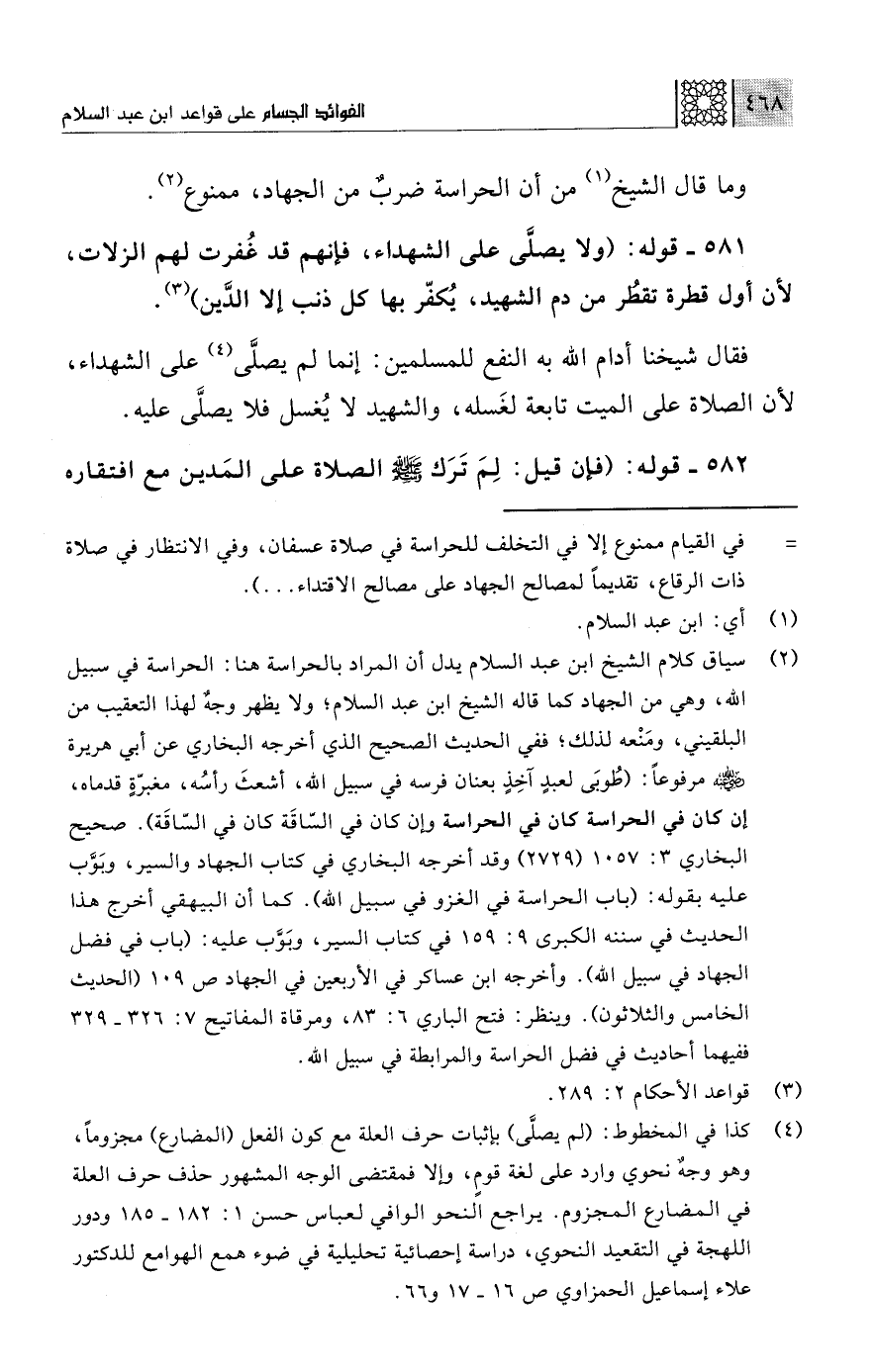 (¬2) سياق كلام الشيخ ابن عبد السلام يدل أن المراد بالحراسة هنا: الحراسة في سبيل الله، وهي من الجهاد كما قاله الشيخ ابن عبد السلام؛ ولا يظهر وجه لهذا التعقيب من البلقيني، ومَنْعه لذلك؛ ففي الحديث الصحيح الذي أخرجه البخاري عن أبي هريرة - رضي الله عنه - مرفوعًا: (طُوبَى لعبدٍ آخِذٍ بعنان فرسه في سبيل الله، أشعثَ رأسُه، مغبرّةٍ قدماه، إن كان في الحراسة كان في الحراسة وإن كان في السّاقَة كان في السّاقَة). صحيح البخاري 3: 1057 (2729) وقد أخرجه البخاري في كتاب الجهاد والسير، وبَوَّب عليه بقوله: (باب الحراسة في الغزو في سبيل الله). كما أن البيهقي أخرج هذا الحديث في سننه الكبرى 9: 159 في كتاب السير، وبَوَّب عليه: (باب في فضل الجهاد في سبيل الله). وأخرجه ابن عساكر في الأربعين في الجهاد ص 109 (الحديث الخامس والثلاثون). وينظر: فتح الباري 6: 83، ومرقاة المفاتيح 7: 326 - 329 ففيهما أحاديث في فضل الحراسة والمرابطة في سبيل الله.