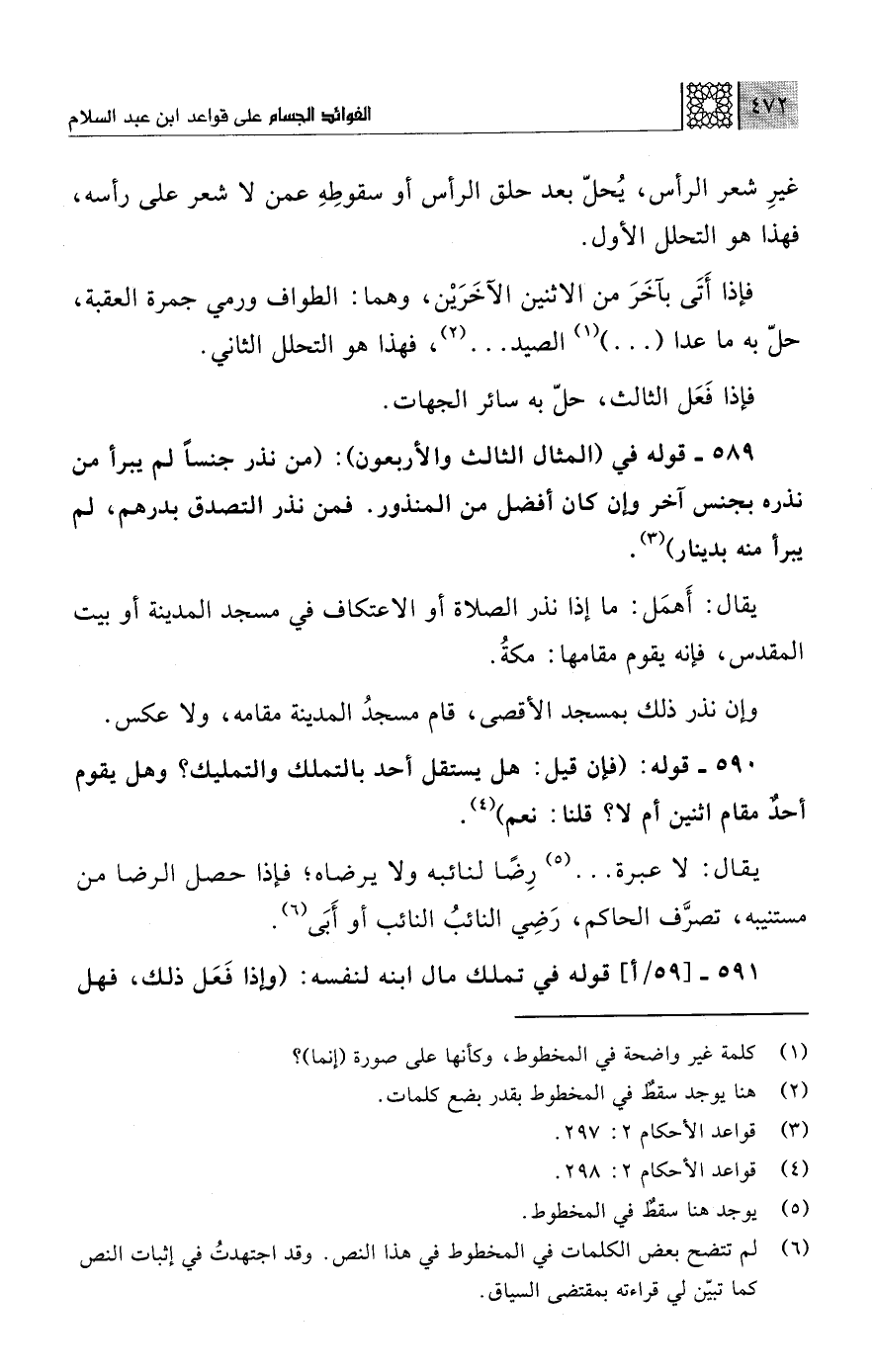 589 - قوله في (المثال الثالث والأربعون): (من نذر جنسًا لم يبرأ من نذره بجنس آخر وإن كان أفضل من المنذور. فمن نذر التصدق بدرهم، لم يبرأ منه بدينار) (¬3).