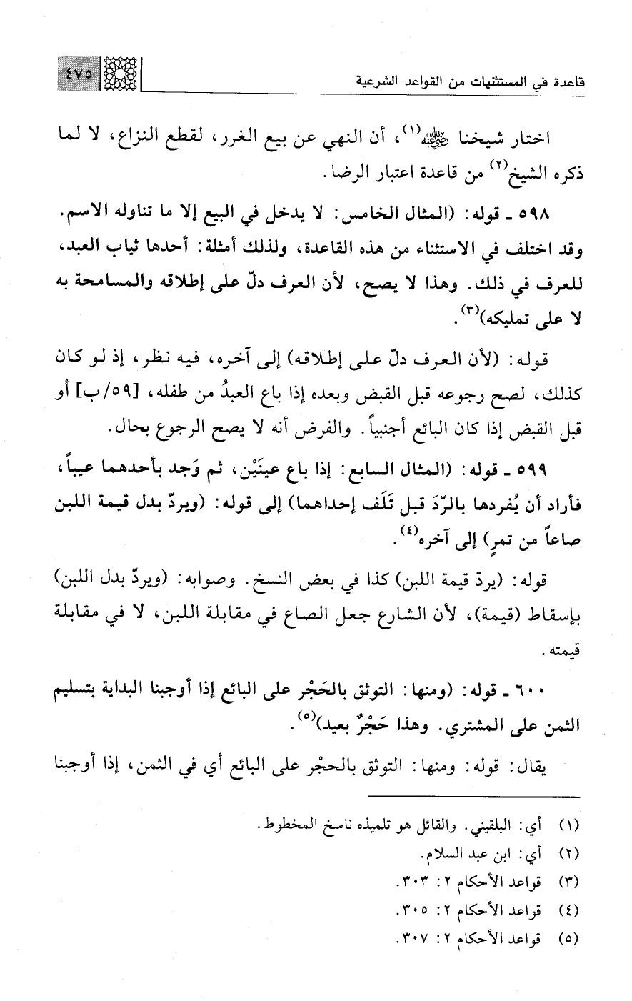 598 - قوله: (المثال الخامس: لا يدخل في البيع إلا ما تناوله الاسم. وقد اختلف في الاستثناء من هذه القاعدة، ولذلك أمثلة: أحدها ثياب العبد، للعرف في ذلك. وهذا لا يصح، لأن العرف دلّ على إطلاقه والمسامحة به لا على تمليكه) (¬3).