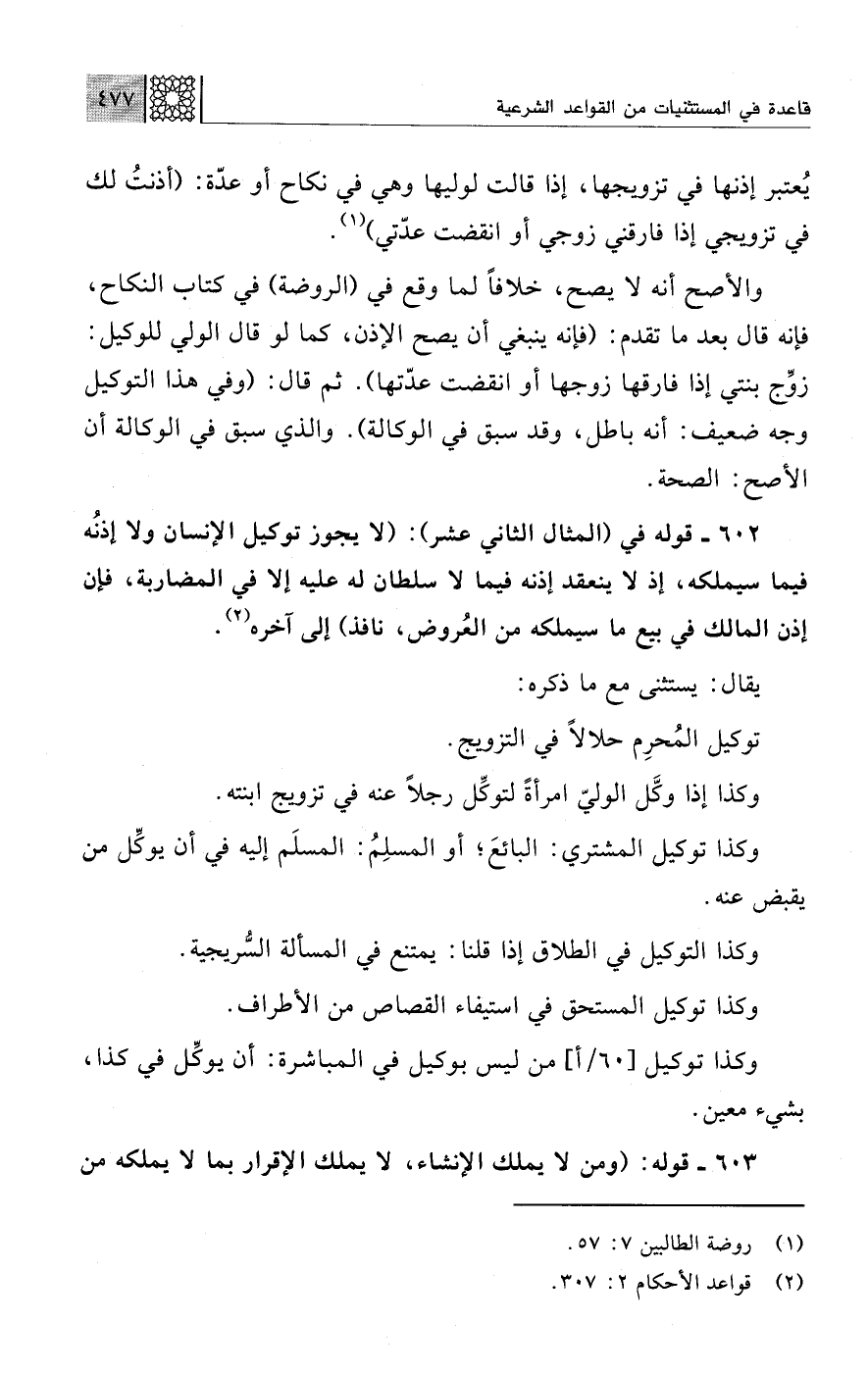 602 - قوله في (المثال الثاني عشر): (لا يجوز توكيل الإنسان ولا إذنُه فيما سيملكه، إذ لا ينعقد إذنه فيما لا سلطان له عليه إلا في المضاربة، فإن إذن المالك في بيع ما سيملكه من العُروض، نافذ) إلى آخره (¬2).