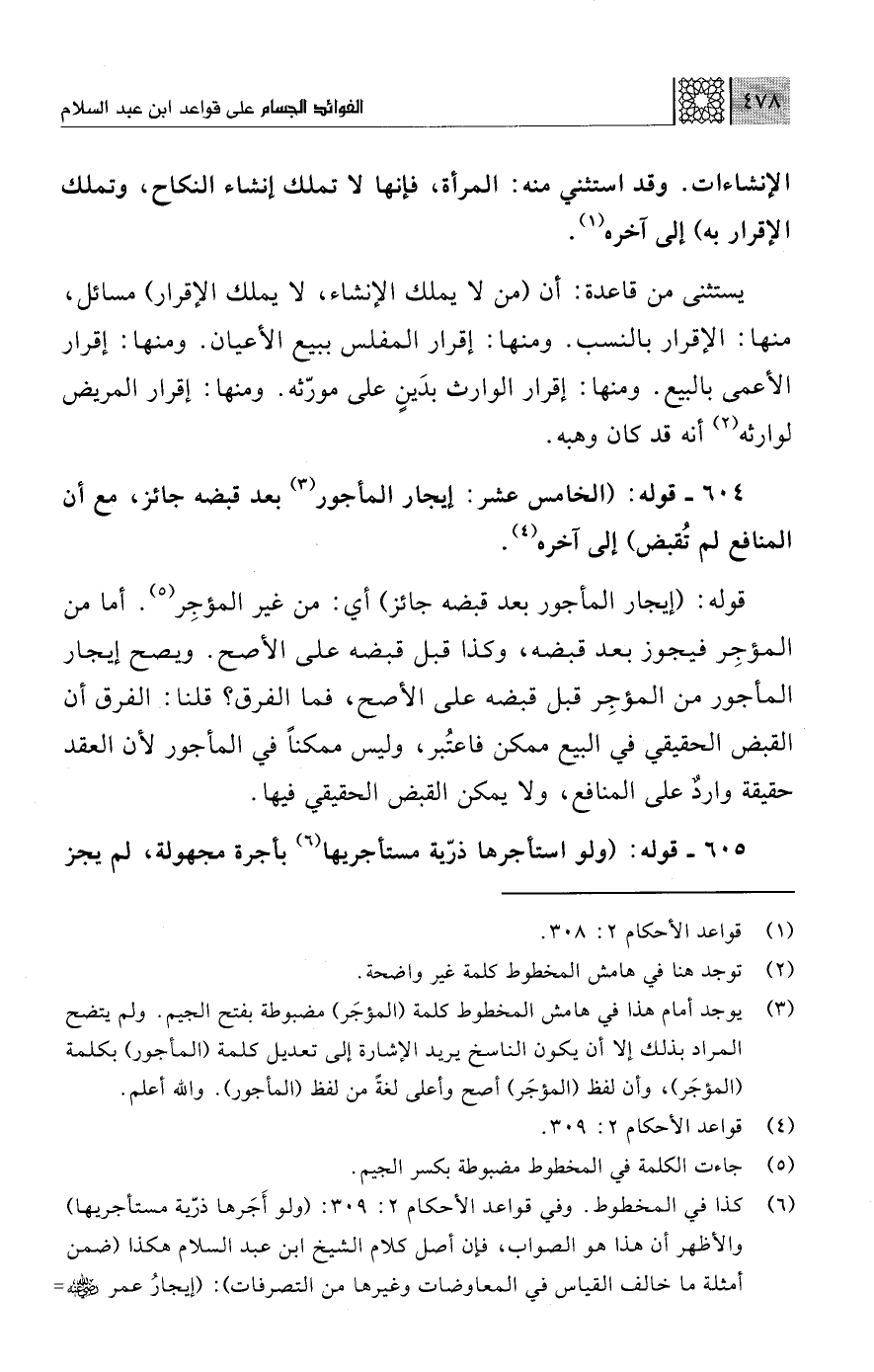 (¬6) كذا في المخطوط. وفي قواعد الأحكام 2: 309: (ولو أَجَرها ذرّية مستأجريها) والأظهر أن هذا هو الصواب، فإن أصل كلام الشيخ ابن عبد السلام هكذا (ضمن أمثلة ما خالف القياس في المعاوضات وغيرها من التصرفات): (إيجارُ عمر - رضي الله عنه - =