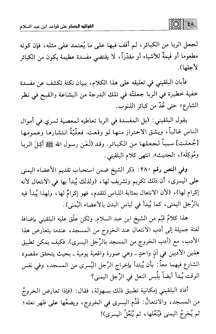 هذا كلامٌ قيّم من الشيخ ابن عبد السلام. ولكن علّق عليه البلقيني بإضافة لفتة جميلة إلى أدب الانتعال عند الخروج من المسجد، عندما يتعارض هذا الأدب، مع (أدب الخروج من المسجد بالرِّجل اليسرى). فكيف يمكن تطبيق هذين الأدبين في آنٍ واحدٍ -وهي صورة واقعية يومية- بحيث يتحقق مقصود الشارع فيهما معًا: بأن يُبتدأ بإخراج الرِّجل اليُسرى من المسجد، وفي نفس الوقت يُبدأ أيضًا بلُبس النعل في الرِّجل اليمنى؟