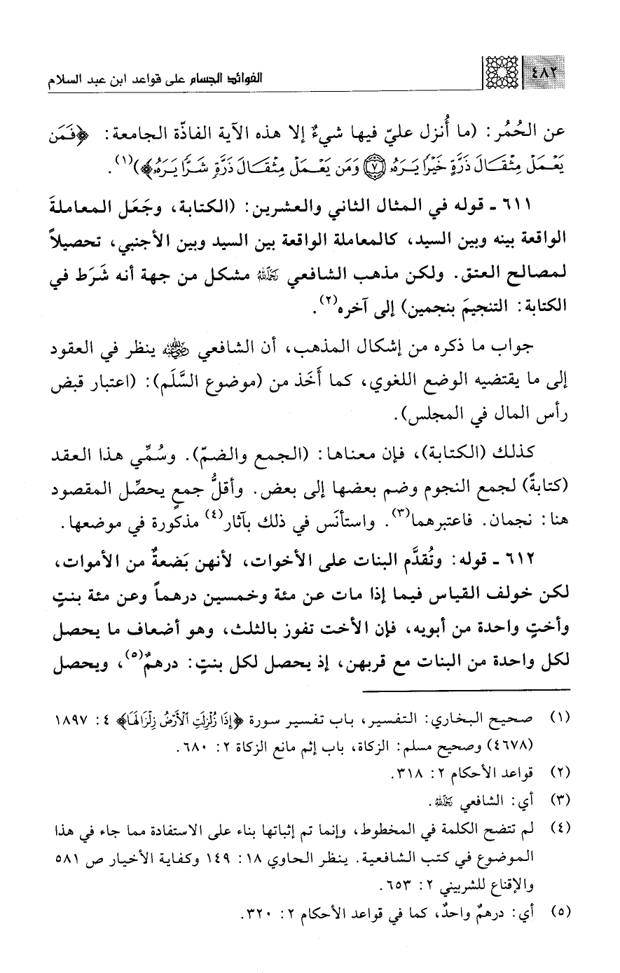 611 - قوله في المثال الثاني والعشرين: (الكتابة، وجَعَل المعاملةَ الواقعة بينه وبين السيد، كالمعاملة الواقعة بين السيد وبين الأجنبي، تحصيلًا لمصالح العتق. ولكن مذهب الشافعي -رحمه الله- مشكل من جهة أنه شَرَط في الكتابة: التنجيمَ بنجمين) إلى آخره (¬2).