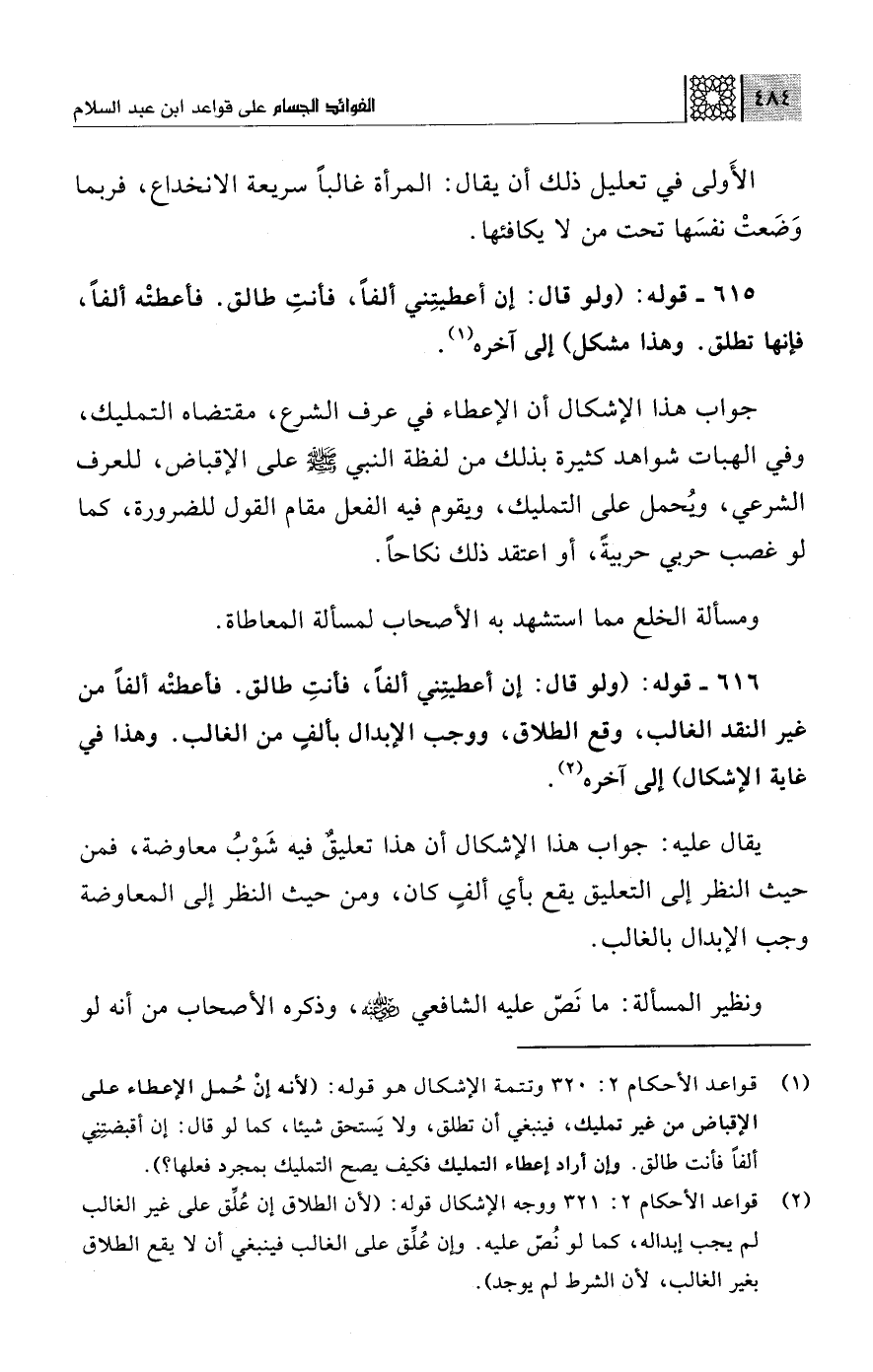 (¬1) قواعد الأحكام 2: 320 وتتمة الإشكال هو قوله: (لأنه إنْ حُمل الإعطاء على الإقباض من غير تمليك، فينبغي أن تطلق، ولا يَستحق شيئًا، كما لو قال: إن أقبضتِني ألفًا فأنت طالق. وإن أراد إعطاء التمليك فكيف يصح التمليك بمجرد فعلها؟).
