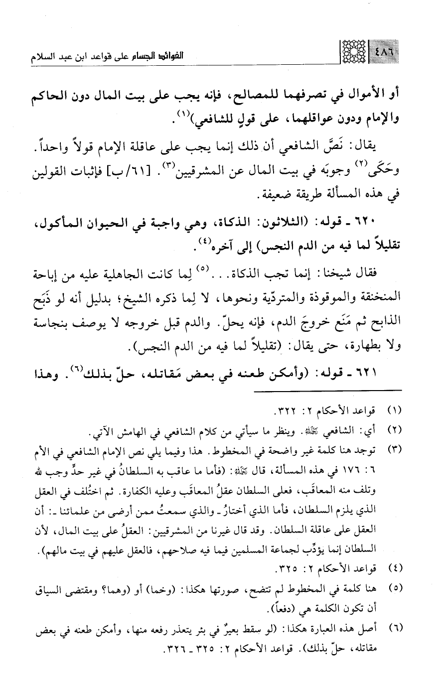(¬3) توجد هنا كلمة غير واضحة في المخطوط. هذا وفيما يلي نص الإمام الشافعي في الأم 6: 176 في هذه المسألة، قال -رحمه الله-: (فأما ما عاقب به السلطانُ في غير حدٍّ وجب لله وتلف منه المعاقَب، فعلى السلطان عقلُ المعاقَب وعليه الكفارة. ثم اختُلف في العقل الذي يلزم السلطان، فأما الذي أختارُ -والذي سمعتُ ممن أرضى من علمائنا-: أن العقل على عاقلة السلطان. وقد قال غيرنا من المشرقيين: العقلُ على بيت المال، لأن السلطان إنما يؤدِّب لجماعة المسلمين فيما فيه صلاحهم، فالعقل عليهم في بيت مالهم).
