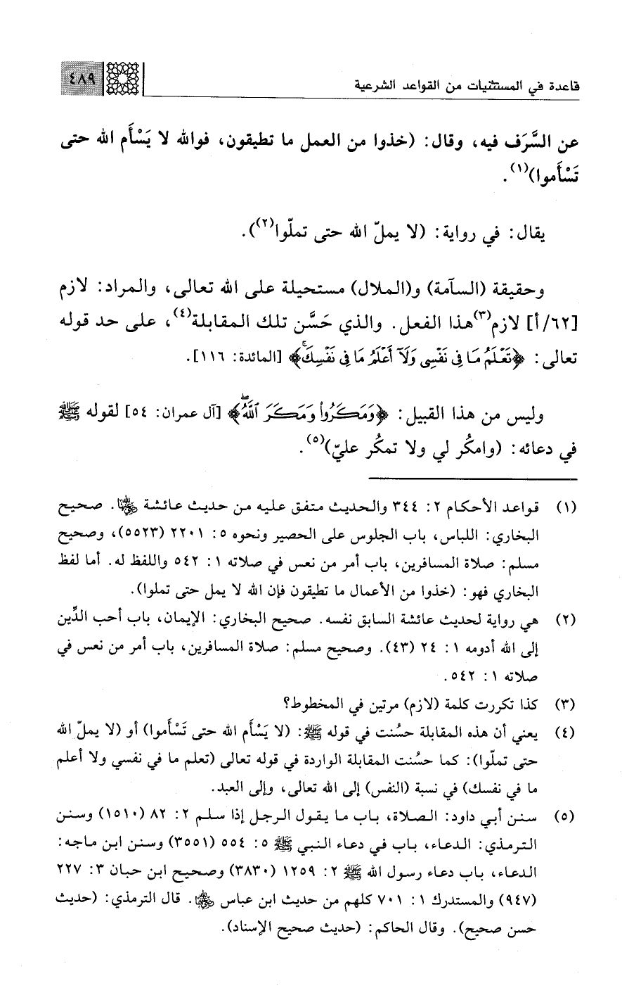 (¬1) قواعد الأحكام 2: 344 والحديث متفق عليه من حديث عائشة بها. صحيح البخاري: اللباس، باب الجلوس على الحصير ونحوه 5: 2201 (5523)، وصحيح مسلم: صلاة المسافرين، باب أمر من نعس في صلاته 1: 542 واللفظ له. أما لفظ البخاري فهو: (خذوا من الأعمال ما تطيقون فإن الله لا يمل حتى تملوا).