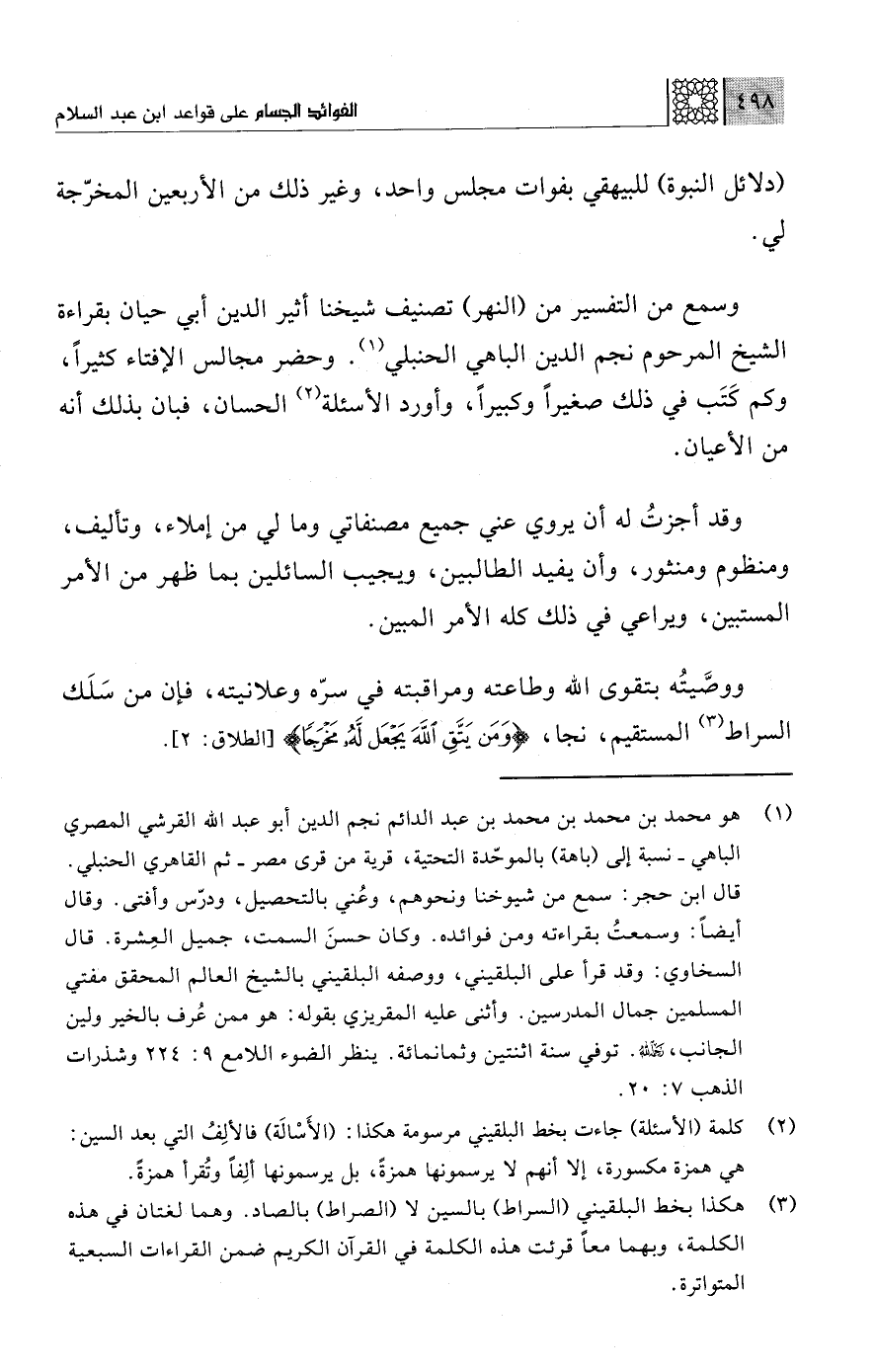 (¬1) هو محمد بن محمد بن محمد بن عبد الدائم نجم الدين أبو عبد الله القرشي المصري الباهي -نسبة إلى (باهة) بالموحّدة التحتية، قرية من قرى مصر- ثم القاهري الحنبلي. قال ابن حجر: سمع من شيوخنا ونحوهم، وعُني بالتحصيل، ودرّس وأفتى. وقال أيضًا: وسمعتُ بقراءته ومن فوائده. وكان حسنَ السمت، جميل العِشرة. قال السخاوي: وقد قرأ على البلقيني، ووصفه البلقيني بالشيخ العالم المحقق مفتي المسلمين جمال المدرسين. وأثنى عليه المقريزي بقوله: هو ممن عُرف بالخير ولين الجانب، -رحمه الله- توفي سنة اثنتين وثمانمائة. ينظر الضوء اللامع 224:9 وشذرات الذهب 7: 20.