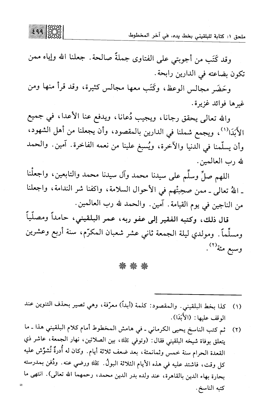 قال ذلك، وكتبه الفقير إلى عفو ربه، عمر البلقيني، حامدًا ومصلّيًا ومسلِّمًا. ومولدي ليلة الجمعة ثاني عشر شعبان المكرّم، سنة أربع وعشرين وسبع مئة (¬2).