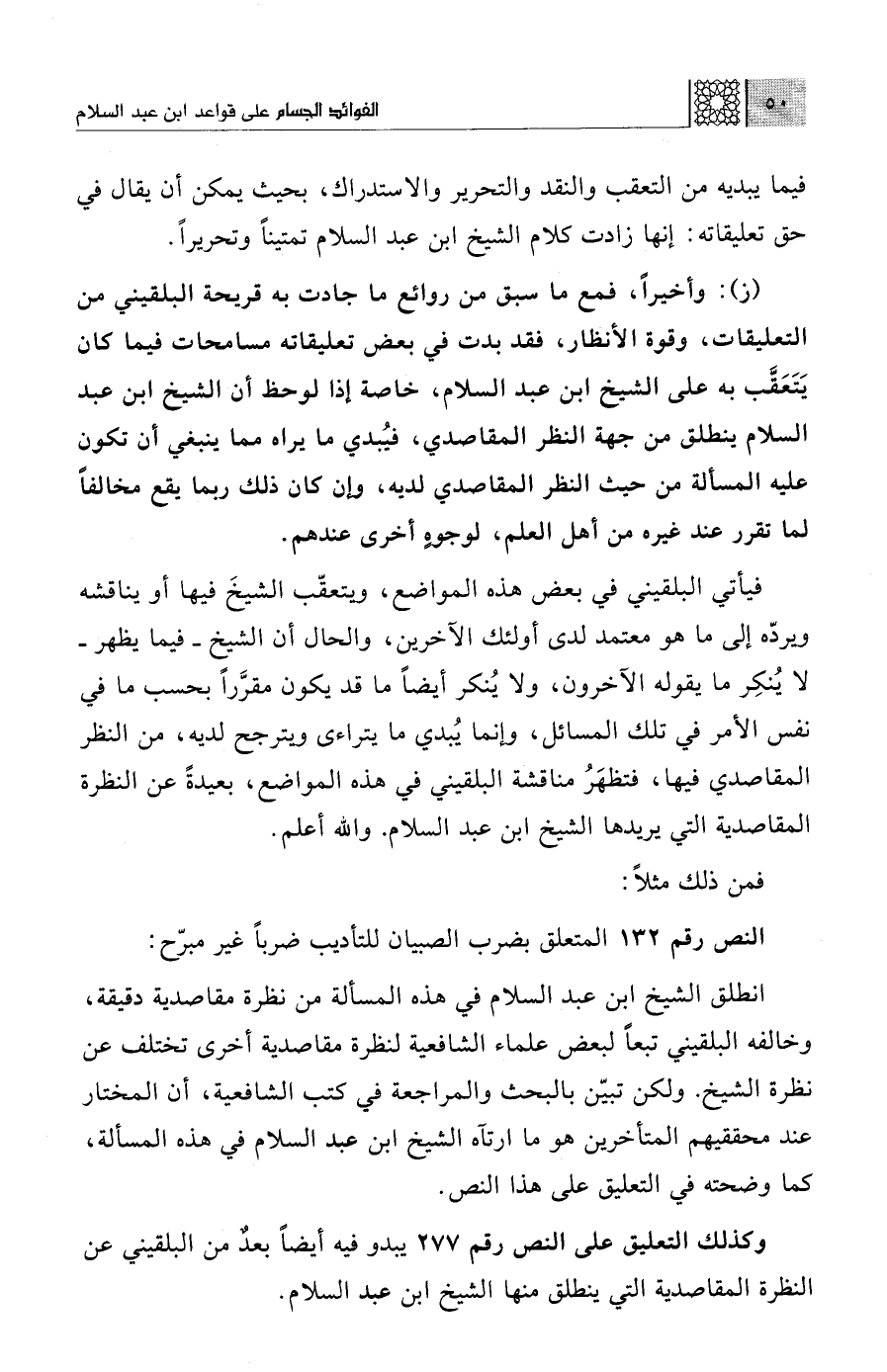 وكذلك التعليق على النص رقم 277 يبدو فيه أيضًا بعدٌ من البلقيني عن النظرة المقاصدية التي ينطلق منها الشيخ ابن عبد السلام.