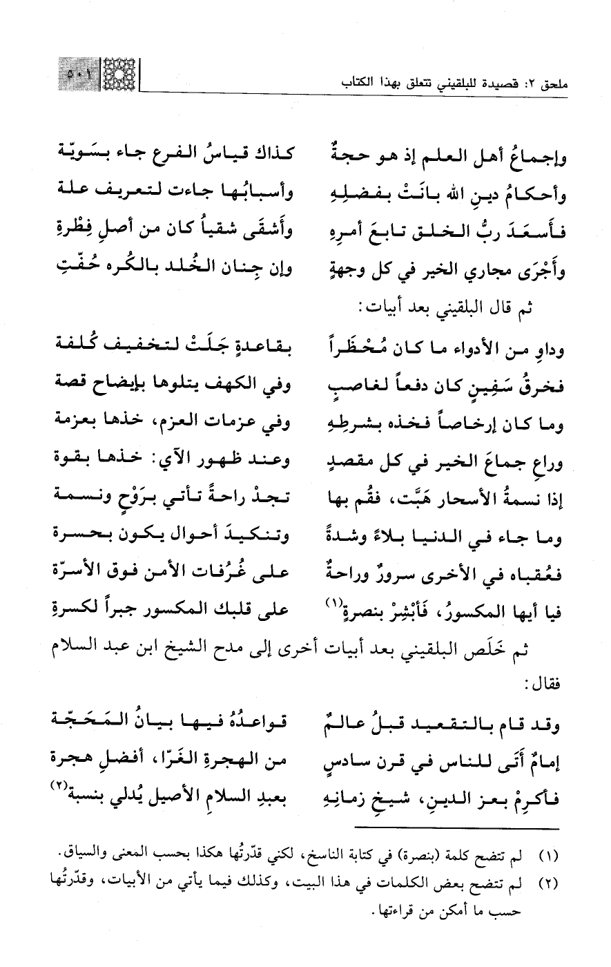 ثم خَلَص البلقيني بعد أبيات أخرى إلى مدح الشيخ ابن عبد السلام فقال: