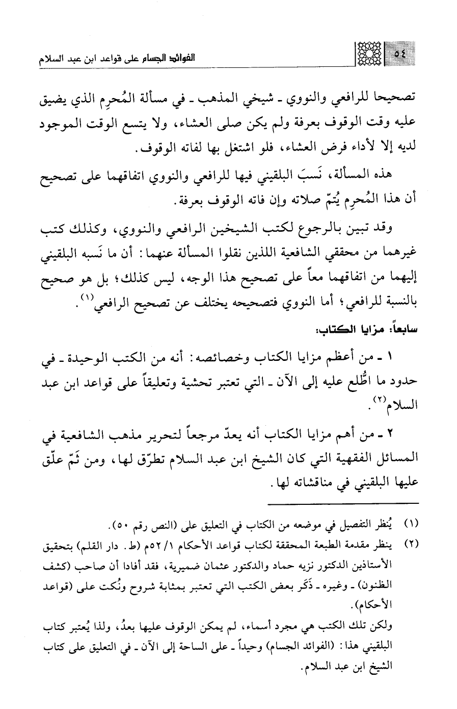 1 - من أعظم مزايا الكتاب وخصائصه: أنَّه من الكتب الوحيدة -في حدود ما اطُّلع عليه إلى الآن- التي تعتبر تحشية وتعليقًا على قواعد ابن عبد السلام (¬2).