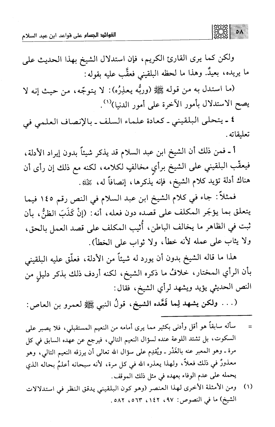 (. . . ولكن يشهد لِما قَعَّده الشيخ، قولُ النبي - صلى الله عليه وسلم - لعمرو بن العاص: