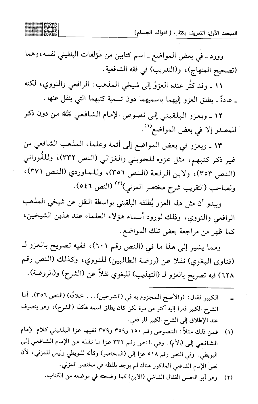 12 - ويعزو البلقيني إلى نصوص الإمام الشافعي -رحمه الله- من دون ذكر للمصدر إلا في بعض المواضع (¬1).