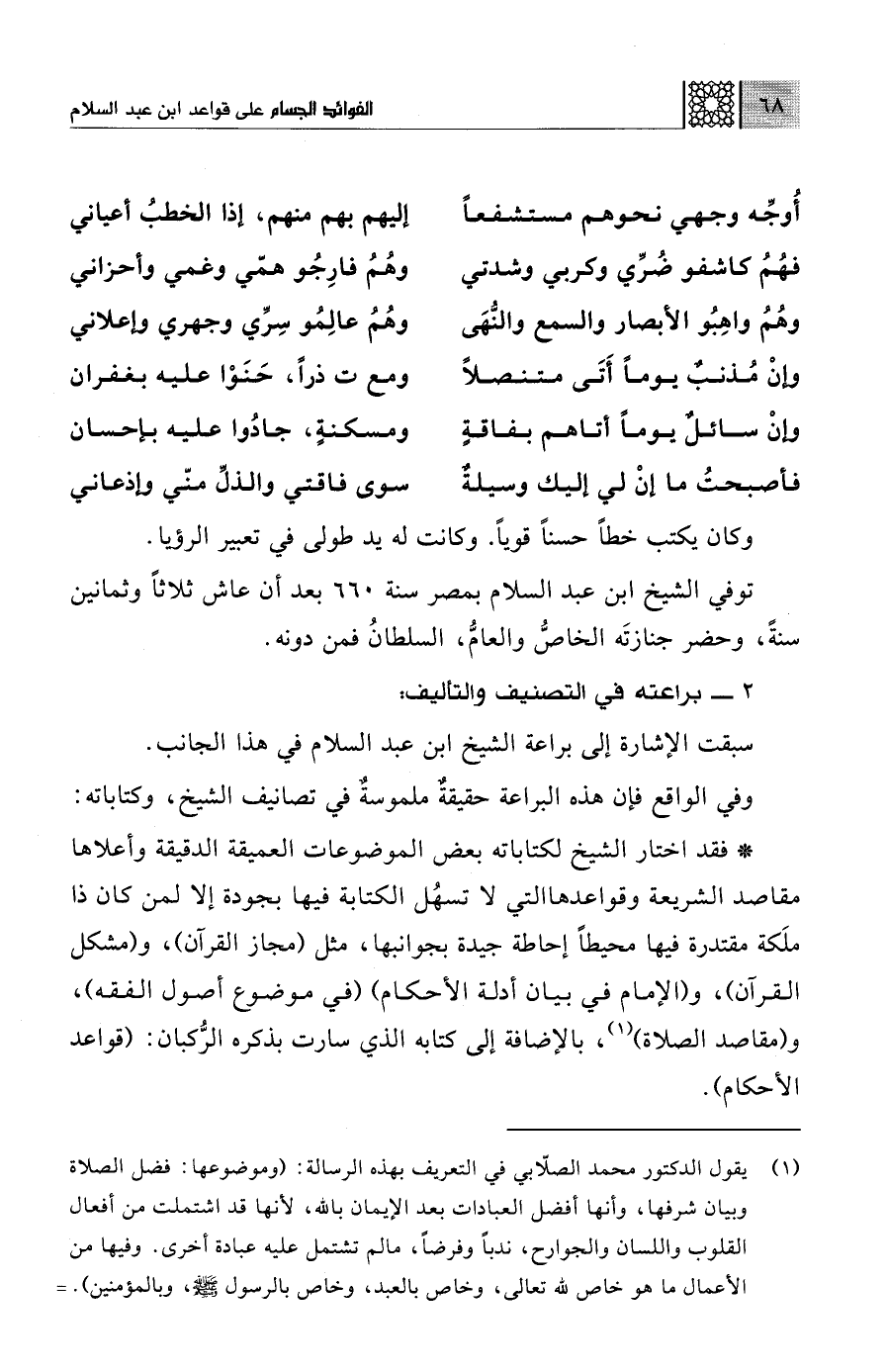 * فقد اختار الشيخ لكتاباته بعض الموضوعات العميقة الدقيقة وأعلاها مقاصد الشريعة وقواعدها التي لا تسهُل الكتابة فيها بجودة إلا لمن كان ذا ملَكة مقتدرة فيها محيطًا إحاطة جيدة بجوانبها، مثل (مجاز القرآن)، و (مشكل القرآن)، و (الإمام في بيان أدلة الأحكام) (في موضوع أصول الفقه)، و (مقاصد الصلاة) (¬1)، بالإضافة إلى كتابه الذي سارت بذكره الرُّكبان: (قواعد الأحكام).
