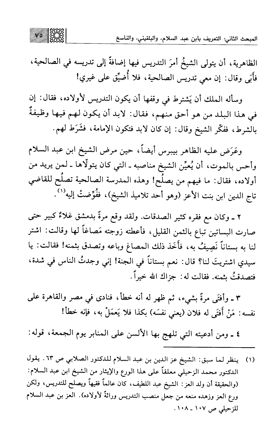 (¬1) ينظر لما سبق: الشيخ عز الدين بن عبد السلام للدكتور الصلابي ص 63. يقول الدكتور محمَّد الزحيلي معلقًا على هذا الورع والإيثار من الشيخ ابن عبد السلام: (والحقيقة أن ولد العز: الشيخ عبد اللطيف، كان عالمًا فقيهًا ويصلح للتدريس، ولكن ورع العز وزهده منعه من جعل منصب التدريس وراثة لأولاده). العز بن عبد السلام للزحيلي ص 107 - 108.
