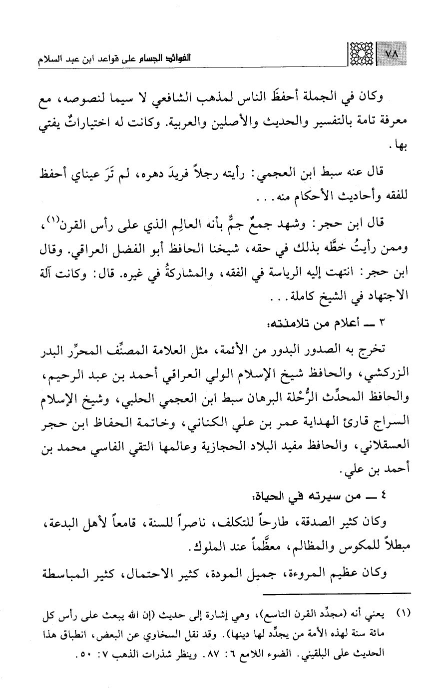 (¬1) يعني أنَّه (مجدّد القرن التاسع)، وهي إشارة إلى حديث (إن الله يبعث على رأس كل مائة سنة لهذه الأمة من يجدّد لها دينها). وقد نقل السخاوي عن البعض، انطباق هذا الحديث على البلقيني. الضوء اللامع 6: 87. وينظر شذرات الذهب 7: 50.