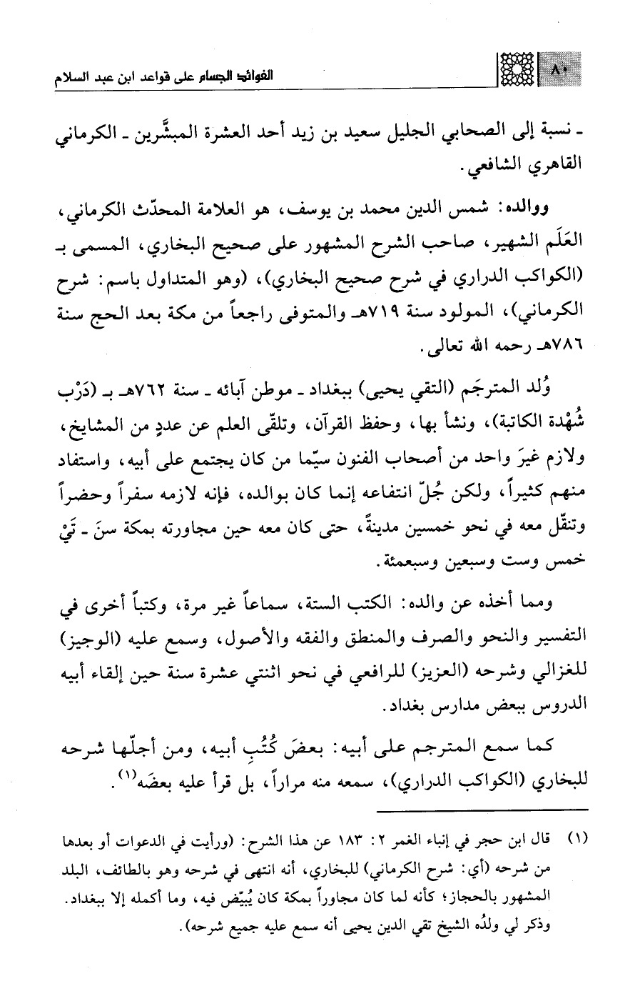 (¬1) قال ابن حجر في إنباء الغمر 2: 183 عن هذا الشرح: (ورأيت في الدعوات أو بعدها من شرحه (أي: شرح الكرماني) للبخاري، أنه انتهى في شرحه وهو بالطائف، البلد المشهور بالحجاز؛ كأنه لما كان مجاورًا بمكة كان يُبيّض فيه، وما أكمله إلا ببغداد. وذكر لي ولدُه الشيخ تقي الدين يحيى أنَّه سمع عليه جميع شرحه).