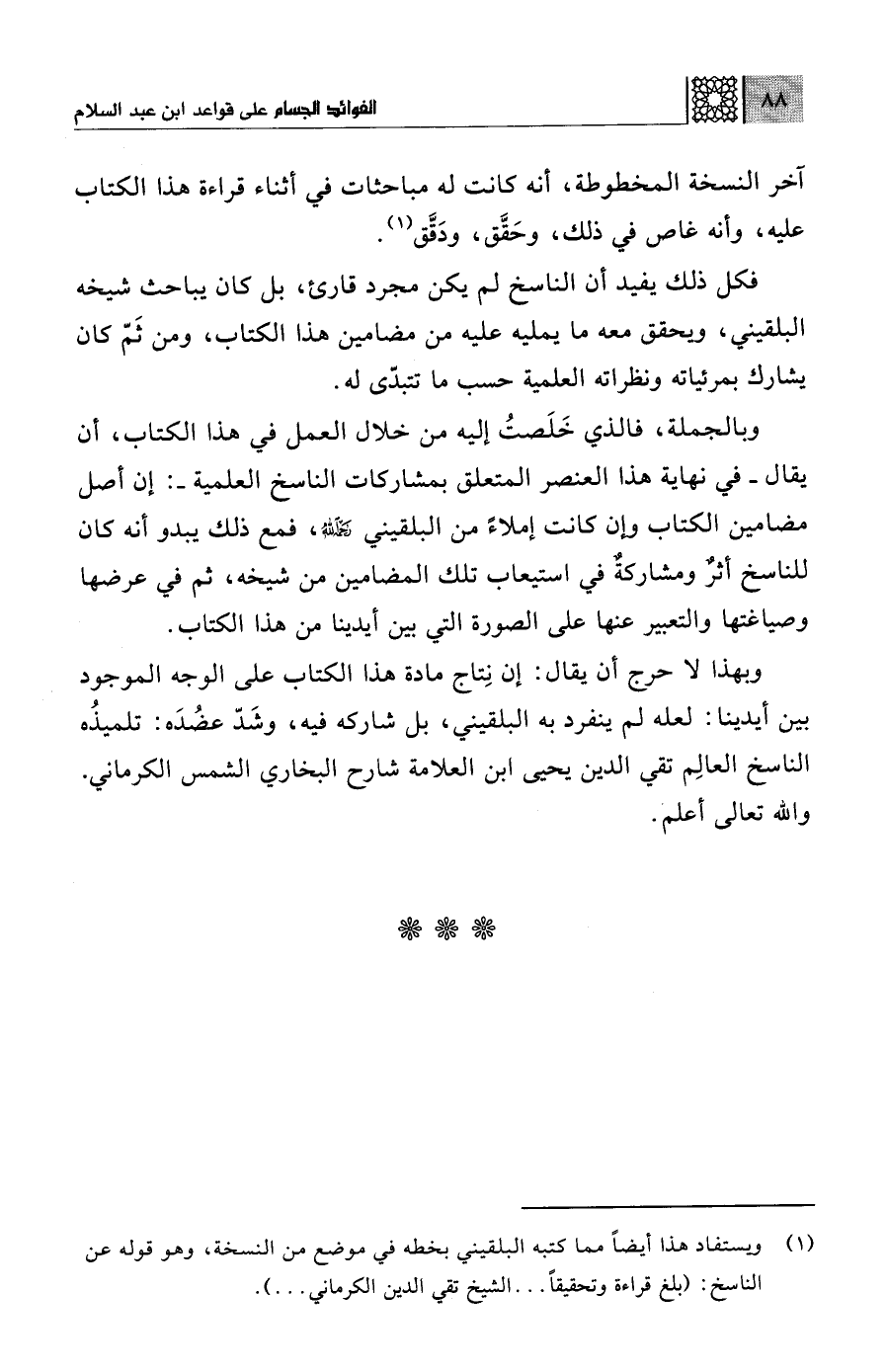 (¬1) ويستفاد هذا أيضًا مما كتبه البلقيني بخطه في موضع من النسخة، وهو قوله عن الناسخ: (بلغ قراءة وتحقيقًا. . . الشيخ تقي الدين الكرماني ...).