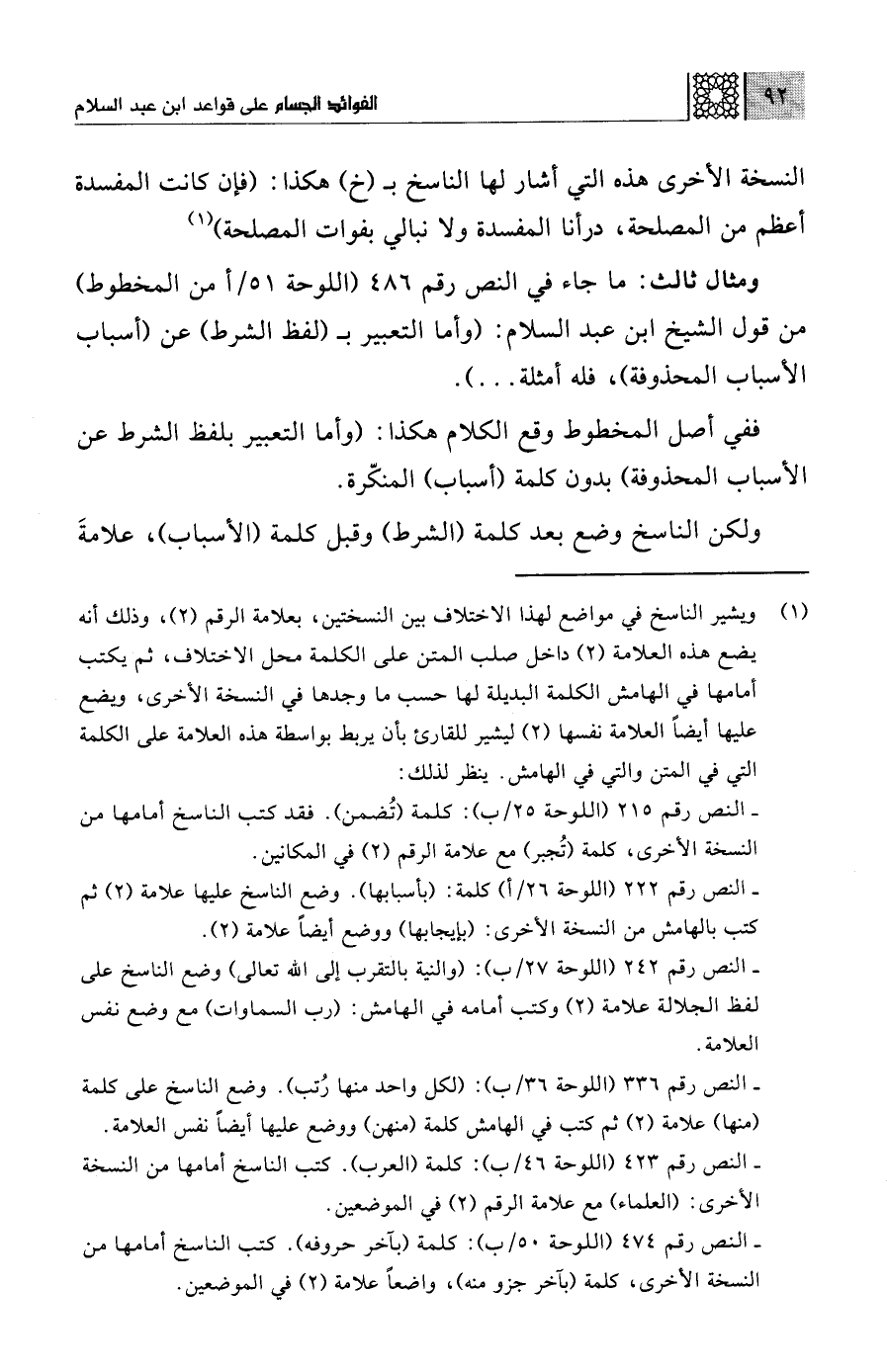 ومثال ثالث: ما جاء في النص رقم 486 (اللوحة 51 / أمن المخطوط) من قول الشيخ ابن عبد السلام: (وأما التعبير بـ (لفظ الشرط) عن (أسباب الأسباب المحذوفة)، فله أمثلة ...).