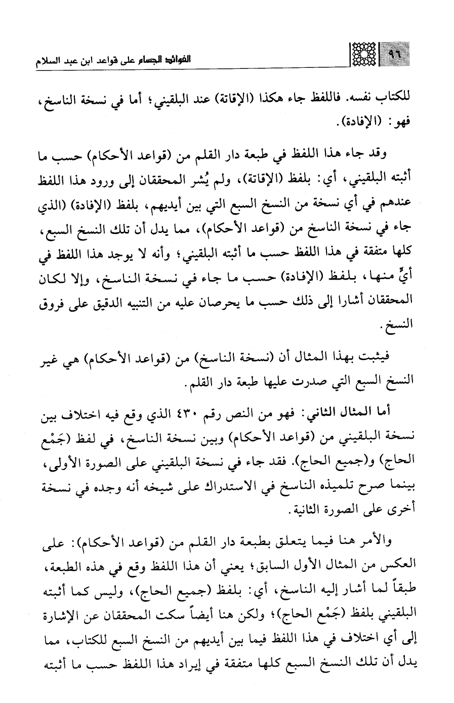 والأمر هنا فيما يتعلق بطبعة دار القلم من (قواعد الأحكام): على العكس من المثال الأول السابق؛ يعني أن هذا اللفظ وقع في هذه الطبعة، طبقًا لما أشار إليه الناسخ، أي: بلفظ (جميع الحاج)، وليس كما أثبته البلقيني بلفظ (جَمْع الحاج)؛ ولكن هنا أيضًا سكت المحققان عن الإشارة إلى أي اختلاف في هذا اللفظ فيما بين أيديهم من النسخ السبع للكتاب، مما يدلّ أن تلك النسخ السبع كلها متفقة في إيراد هذا اللفظ حسب ما أثبته