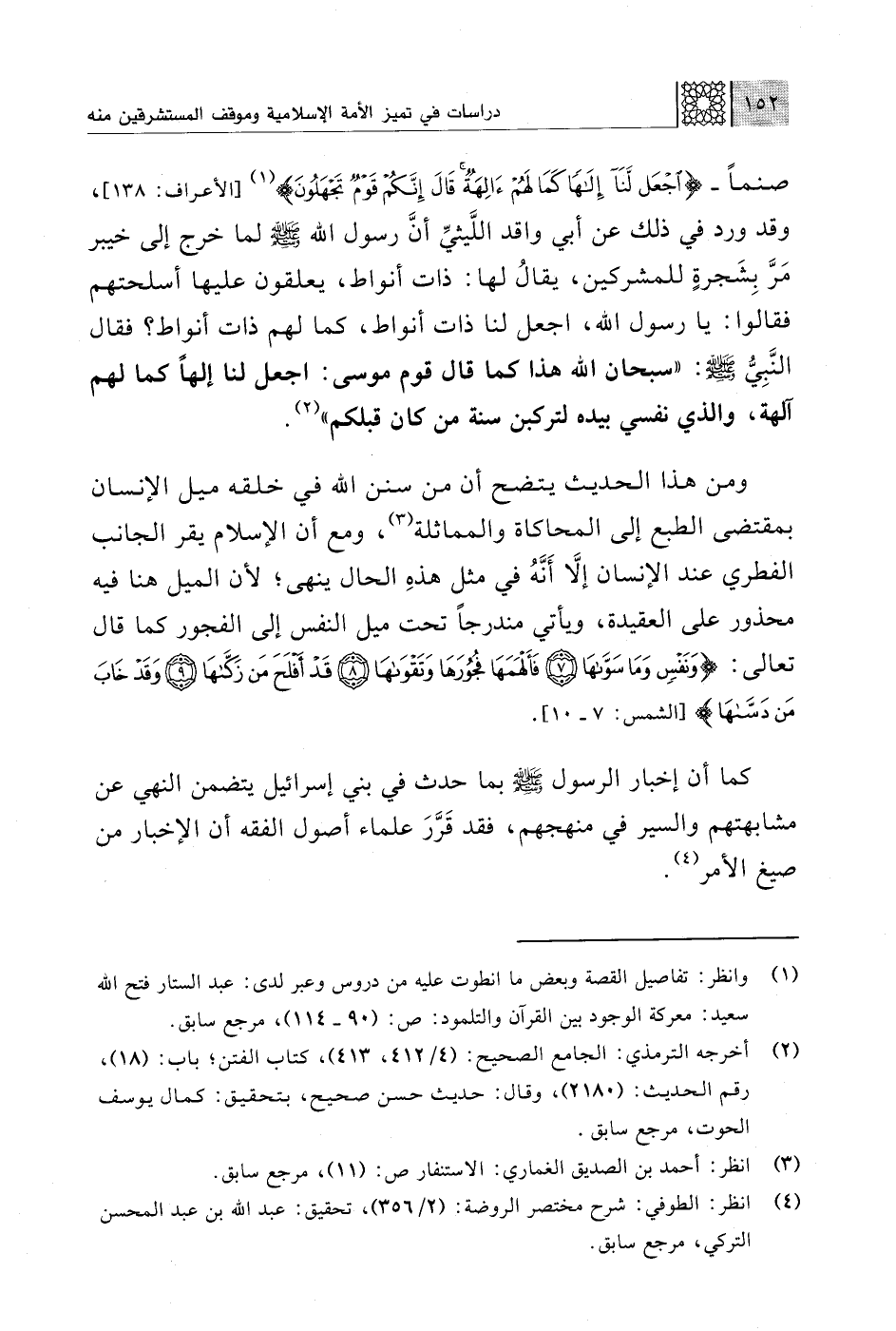 ومن هذا الحديث يتضح أن من سنن اللَّه في خلقه ميل الإنسان بمقتضى الطبع إلى المحاكاة والمماثلة (¬3)، ومع أن الإسلام يقر الجانب الفطري عند الإنسان إلّا أَنَّهُ في مثل هذهِ الحال ينهى؛ لأن الميل هنا فيه محذور على العقيدة، ويأتي مندرجًا تحت ميل النفس إلى الفجور كما قال تعالى: {وَنَفْسٍ وَمَا سَوَّاهَا (7) فَأَلْهَمَهَا فُجُورَهَا وَتَقْوَاهَا (8) قَدْ أَفْلَحَ مَنْ زَكَّاهَا (9) وَقَدْ خَابَ مَنْ دَسَّاهَا} [الشمس: 7 - 10].