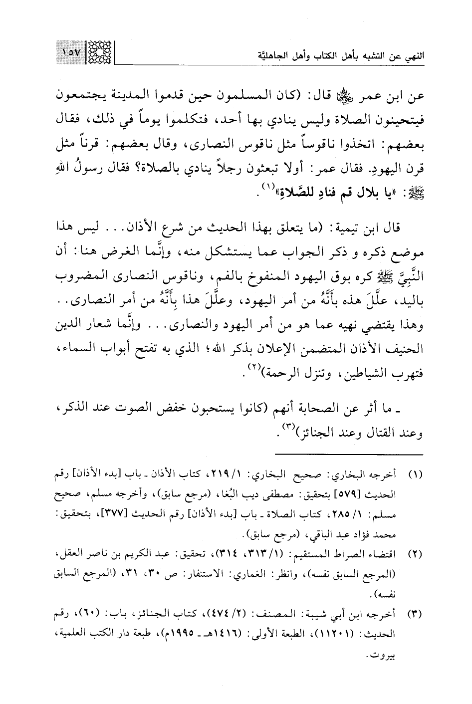 قال ابن تيمية: (ما يتعلق بهذا الحديث من شرع الأذان. . . ليس هذا موضع ذكره وذكر الجواب عما يستشكل منه، وإنَّما الغرض هنا: أن النَّبِيَّ -صلى اللَّه عليه وسلم- كره بوق اليهود المنفوخ بالفم، وناقوس النصارى المضروب باليد، علَّلَ هذه بأَنَّهُ من أمر اليهود، وعلَّلَ هذا بِأَنَّهُ من أمر النصارى. . وهذا يقتضي نهيه عما هو من أمر اليهود والنصارى. . . وإنَّما شعار الدين الحنيف الأذان المتضمن الإعلان بذكر اللَّه؛ الذي به تفتح أبواب السماء، فتهرب الشياطين، وتنزل الرحمة) (¬2).