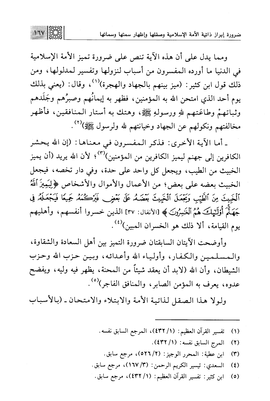 ومما يدل على أن هذه الآية تنص على ضرورة تميُّز الأمة الإسلامية في الدنيا ما أورده المفسرون من أسباب لنزولها وتفسير لمدلولها، ومن ذلك قول ابن كثير: (ميز بينهم بالجهاد والهجرة) (¬1)، وقال: (يعني بذلك يوم أحد الذي امتحن اللَّه به المؤمنين، فظهر به إيمانُهم وصبرُهم وجَلَدهم وثباتهمْ وطاعَتهم للَّهِ ورسولهِ -صلى اللَّه عليه وسلم-، وهتك به أستار المنافقين، فأظهر مخالفتهم ونكولهم عن الجهاد وخيانتهم للَّه ولرسول -صلى اللَّه عليه وسلم-) (¬2).