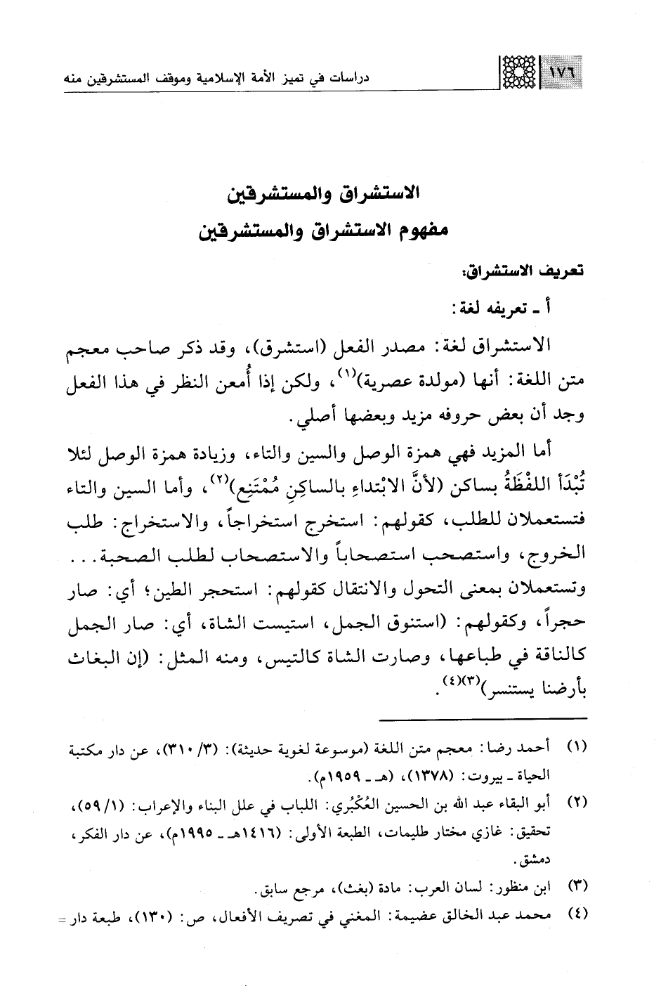 الاستشراق لغة: مصدر الفعل (استشرق)، وقد ذكر صاحب معجم متن اللغة: أنها (مولدة عصرية) (¬1)، ولكن إذا أُمعن النظر في هذا الفعل وجد أن بعض حروفه مزيد وبعضها أصلي.