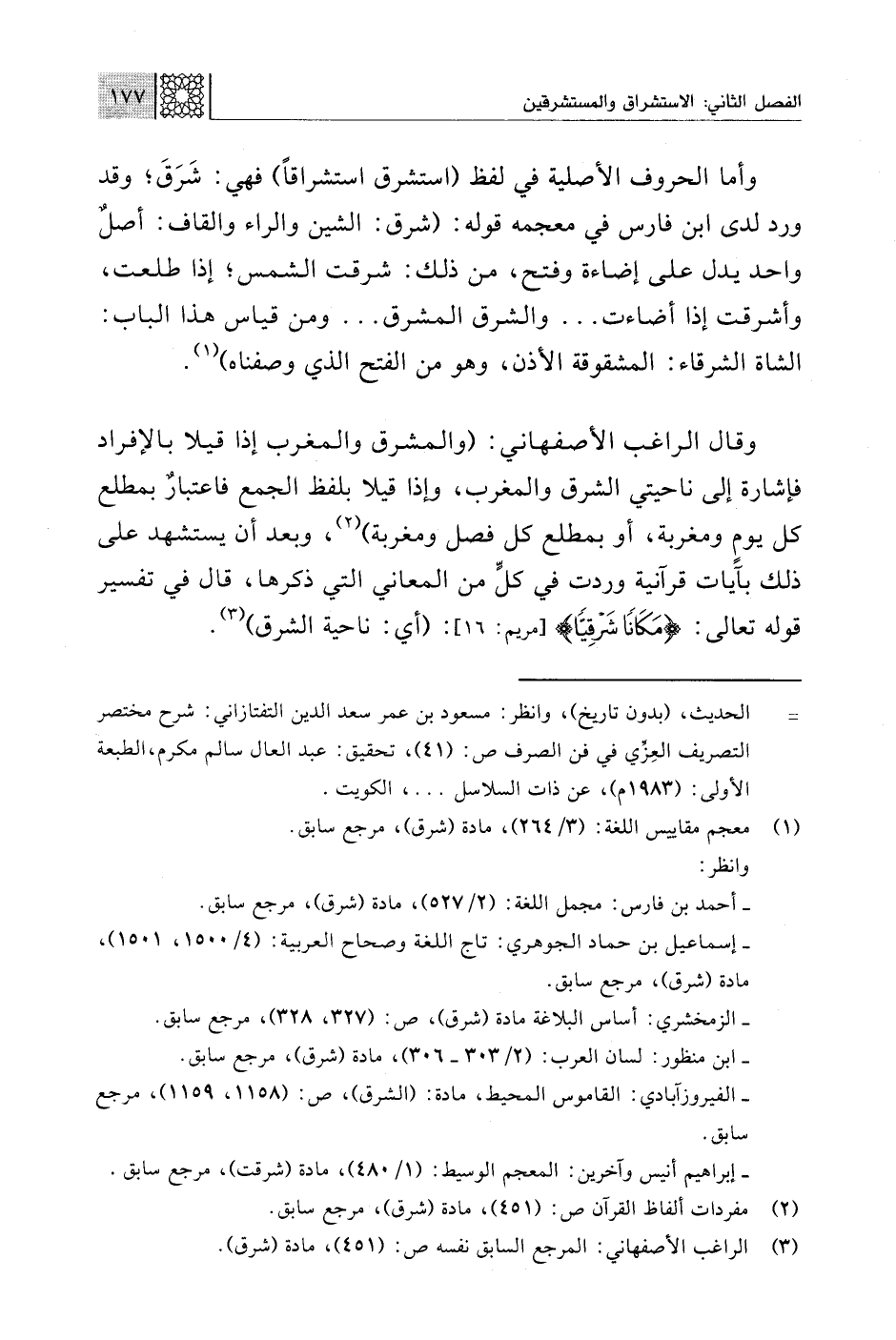 وأما الحروف الأصلية في لفظ (استشرق استشراقًا) فهي: شَرَقَ؛ وقد ورد لدى ابن فارس في معجمه قوله: (شرق: الشين والراء والقاف: أصل واحد يدل على إضاءة وفتح، من ذلك: شرقت الشمس؛ إذا طلعت، وأشرقت إذا أضاءت. . . والشرق المشرق. . . ومن قياس هذا الباب: الشاة الشرقاء: المشقوقة الأذن، وهو من الفتح الذي وصفناه) (¬1).