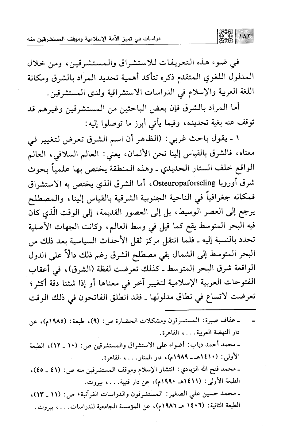 1 - يقول باحث غربي: (الظاهر أن اسم الشرق تعرض لتغيير في معناه، فالشرق بالقياس إلينا نحن الألمان، يعني: العالم السلافي، العالم الواقع خلف الستار الحديدي -وهذه المنطقة يختص بها علميًا بحوث شرق أوروبا osteuropaforscling ، أما الشرق الذي يختص به الاستشراق فمكانه جغرافيًا في الناحية الجنوبية الشرقية بالقياس إلينا، والمصطلح يرجع إلى العصر الوسيط، بل إلى العصور القديمة، إلى الوقت الذي كان فيه البحر المتوسط يقع كما قيل في وسط العالم، وكانت الجهات الأصلية تحدد بالنسبة إليه- فلما انتقل مركز ثقل الأحداث السياسية بعد ذلك من البحر المتوسط إلى الشمال بقي مصطلح الشرق رغم ذلك دالًّا على الدول الواقعة شرق البحر المتوسط -كذلك تعرضت لفظة (الشرق)، في أعقاب الفتوحات العربية الإسلامية لتغيير آخر في معناها أو إذا شئنا دقة أكثر؛ تعرضت لاتساع في نطاق مدلولها- فقد انطلق الفاتحون في ذلك الوقت