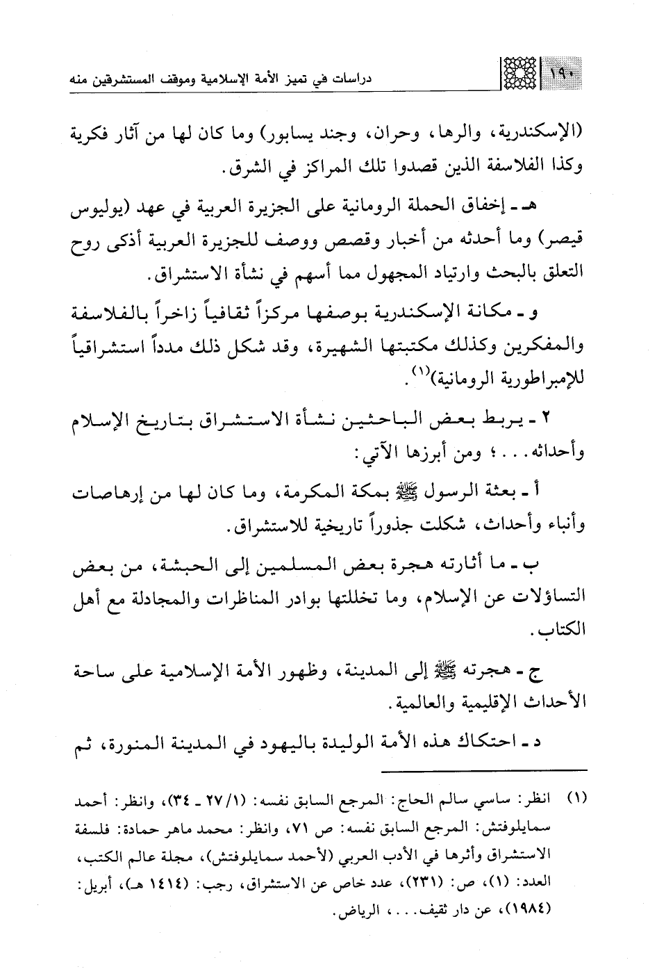 (¬1) انظر: ساسي سالم الحاج: المرجع السابق نفسه: (1/ 27 - 34)، وانظر: أحمد سمايلوفتش: المرجع السابق نفسه: ص 71، وانظر: محمد ماهر حمادة: فلسفة الاستشراف وأثرها في الأدب العربي (لأحمد سمايلوفتش)، مجلة عالم الكتب، العدد: (1)، ص: (231)، عدد خاص عن الاستشراق، رجب: (1414 هـ)، أبريل: (1984)، عن دار ثقيف. . . " الرياض.