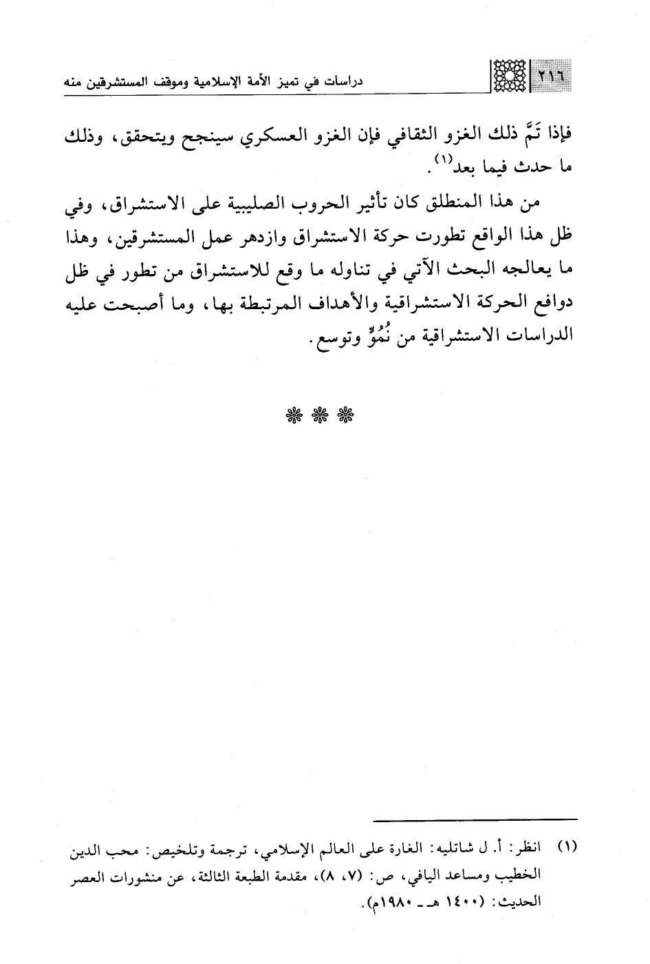 (¬1) انظر: أ. ل شاتليه: الغارة على العالم الإسلامي، ترجمة وتلخيص: محب الدين الخطيب ومساعد اليافي، ص: (7، 8)، مقدمة الطبعة الثالثة، عن منشورات العصر الحديث: (1400 هـ - 1980 م).