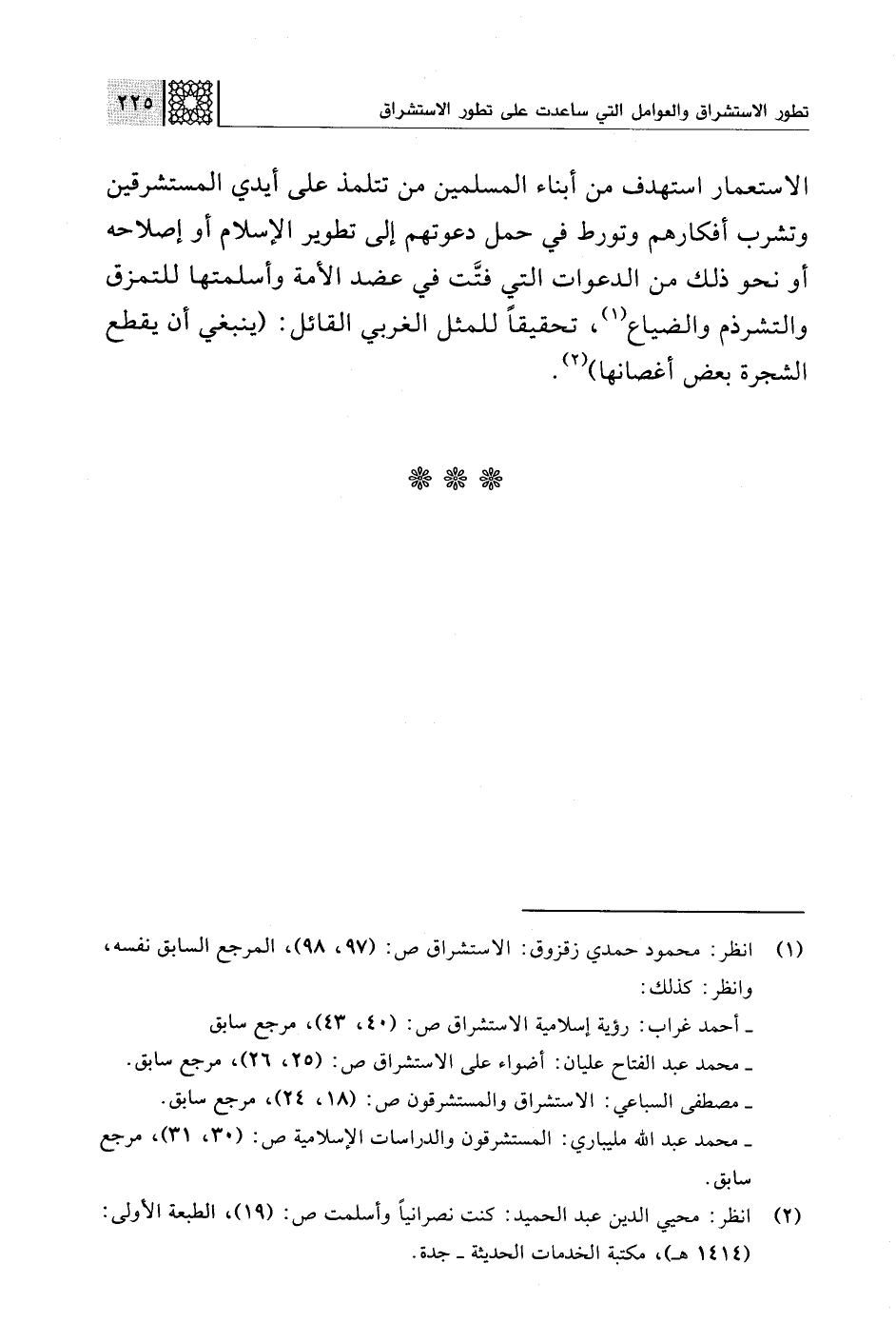 الاستعمار استهدف من أبناء المسلمين من تتلمذ على أيدي المستشرقين وتشرب أفكارهم وتورط في حمل دعوتهم إلى تطوير الإسلام أو إصلاحه أو نحو ذلك من الدعوات التي فتَّت في عضد الأمة وأسلمتها للتمزق والتشرذم والضياع (¬1)، تحقيقًا للمثل الغربي القائل: (ينبغي أن يقطع الشجرة بعض أغصانها) (¬2).