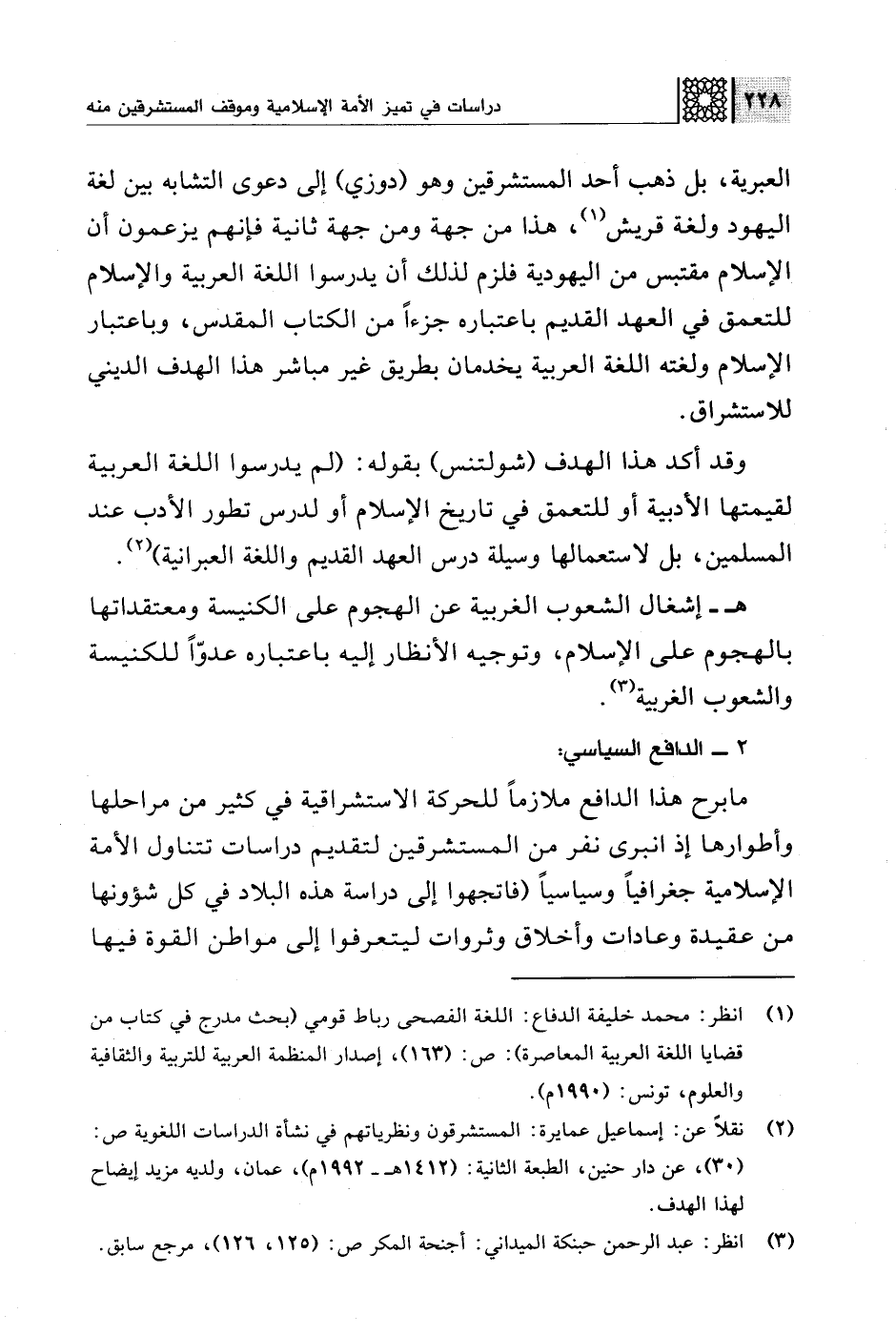 العبرية، بل ذهب أحد المستشرقين وهو (دوزي) إلى دعوى التشابه بين لغة اليهود ولغة قريش (¬1)، هذا من جهة ومن جهة ثانية فإنهم يزعمون أن الإسلام مقتبس من اليهودية فلزم لذلك أن يدرسوا اللغة العربية والإسلام للتعمق في العهد القديم باعتباره جزءًا من الكتاب المقدس، وباعتبار الإسلام ولغته اللغة العربية يخدمان بطريق غير مباشر هذا الهدف الديني للاستشراق.