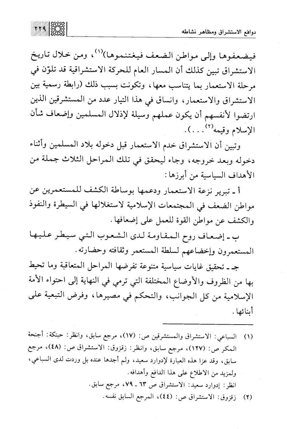 (¬1) السباعي: الاستشراق والمستشرقين ص: (17)، مرجع سابق، وانظر: حبنكة: أجنحة المكر ص: (127)، مرجع سابق، وانظر: زقزوق: الاستشراق ص: (48)، مرجع سابق، وقد عزا هذه العبارة لإدوارد سعيد، ولم أجدها عنده بل وردت لدى السباعي، ولمزيد من الاطلاع على هذا الدافع وأهدافه.