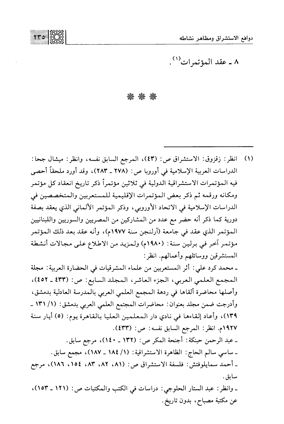 (¬1) انظر: زقزوق: الاستشراق ص: (43)، المرجع السابق نفسه، وانظر: ميشال جحا: الدراسات العربية الإسلامية في أوروبا ص: (278 - 283)، وقد أورد ملحقًا أحصى فيه المؤتمرات الاستشراقية الدولية في ثلاثين مؤتمرًا ذكر تاريخ انعقاد كل مؤتمر ومكانه ورقمه ثم ذكر بعض المؤتمرات الإقليمية للمستعربين والمتخصصين في الدراسات الإسلامية في الاتحاد الأوروبي، وذكر المؤتمر الألماني الذي يعقد بصفة دورية كما ذكر أنه حضر مع عدد من المشاركين من المصريين والسوريين واللبنانيين المؤتمر الذي عقد في جامعة (أرلنجن سنة 1977 م)، وأنه عقد بعد ذلك المؤتمر مؤتمر آخر في برلين سنة: (1980 م) ولمزيد من الاطلاع على مجالات أنشطة المسثشرقين ووسائلهم وأعمالهم. انظر: