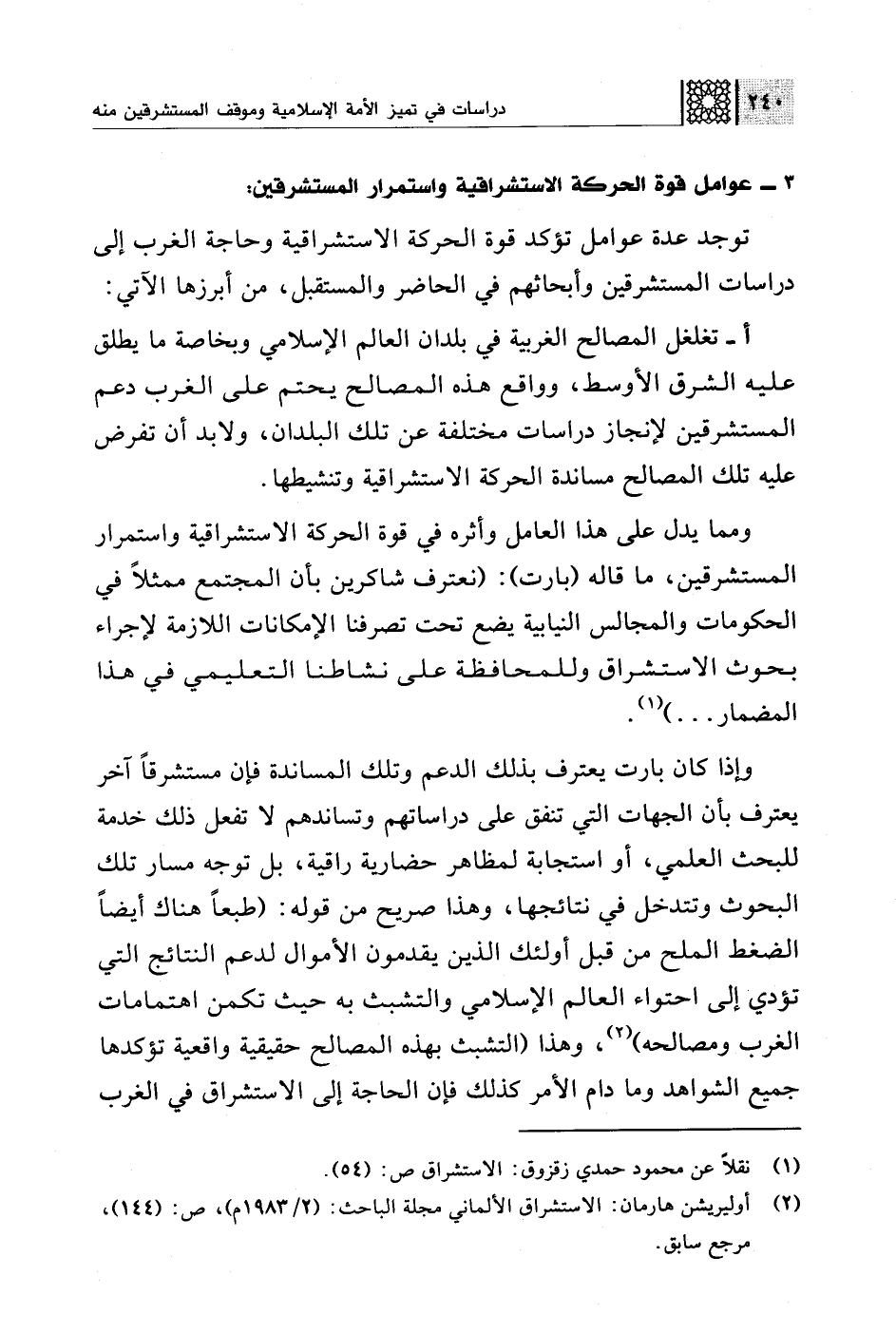 وإذا كان بارت يعترف بذلك الدعم وتلك المساندة فإن مستشرقًا آخر يعترف بأن الجهات التي تنفق على دراساتهم وتساندهم لا تفعل ذلك خدمة للبحث العلمي، أو استجابة لمظاهر حضارية راقية، بل توجه مسار تلك البحوث وتتدخل في نتائجها، وهذا صريح من قوله: (طبعًا هناك أيضًا الضغط الملح من قبل أولئك الذين يقدمون الأموال لدعم النتائج التي تؤدي إلى احتواء العالم الإسلامي والتشبث به حيث تكمن اهتمامات الغرب ومصالحه) (¬2)، وهذا (التشبث بهذه المصالح حقيقية واقعية تؤكدها جميع الشواهد وما دام الأمر كذلك فإن الحاجة إلى الاستشراق في الغرب