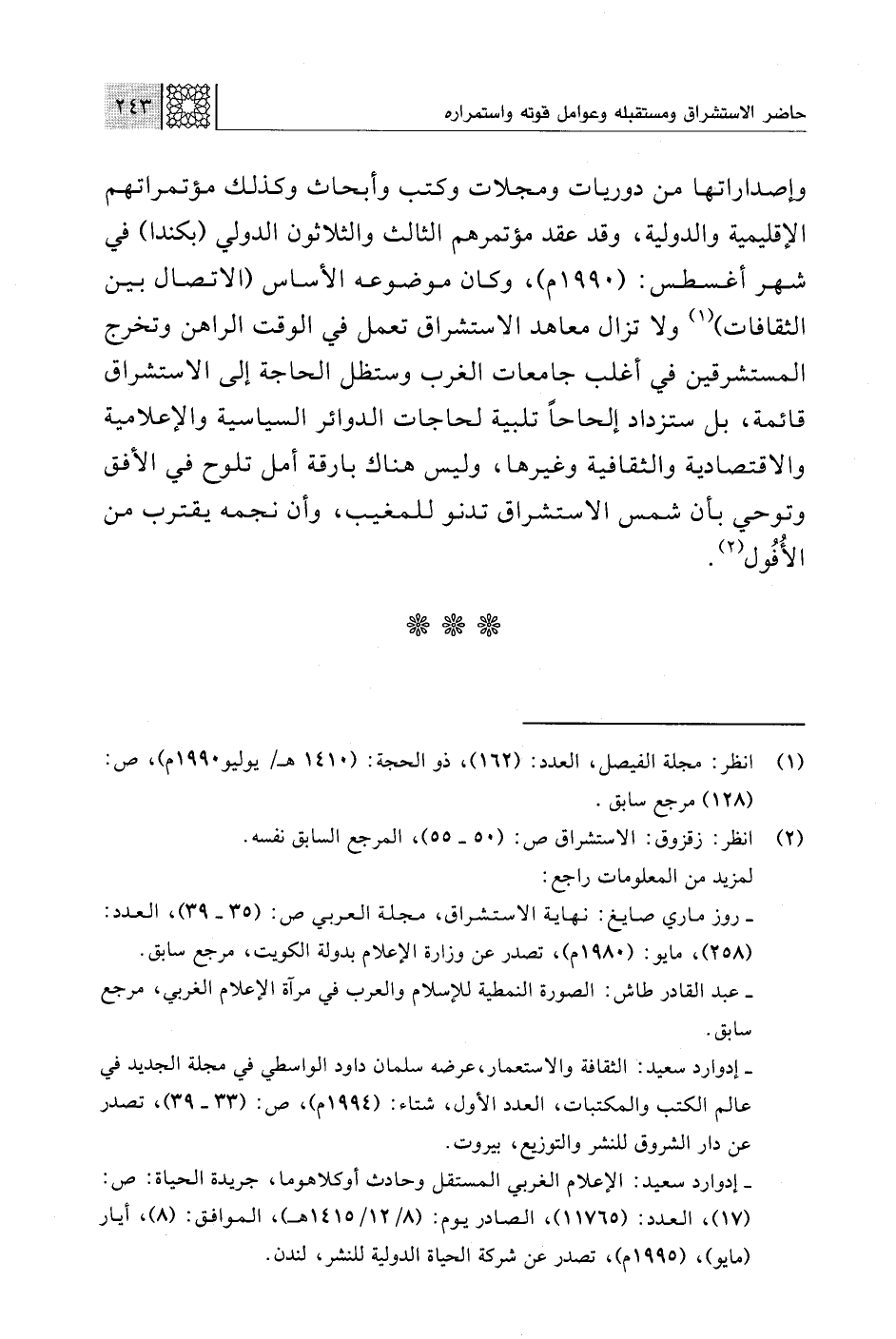 وإصداراتها من دوريات ومجلات وكتب وأبحاث وكذلك مؤتمراتهم الإقليمية والدولية، وقد عقد مؤتمرهم الثالث والثلاثون الدولي (بكندا) في شهر أغسطس: (1990 م)، وكان موضوعه الأساس (الاتصال بين الثقافات) (¬1) ولا تزال معاهد الاستشراق تعمل في الوقت الراهن وتخرج المستشرقين في أغلب جامعات الغرب وستظل الحاجة إلى الاستشراق قائمة، بل ستزداد إلحاحًا تلبية لحاجات الدوائر السياسية والإعلامية والاقتصادية والثقافية وغيرها، وليس هناك بارقة أمل تلوح في الأفق وتوحي بأن شمس الاستشراق تدنو للمغيب، وأن نجمه يقترب من الأُفُول (¬2).