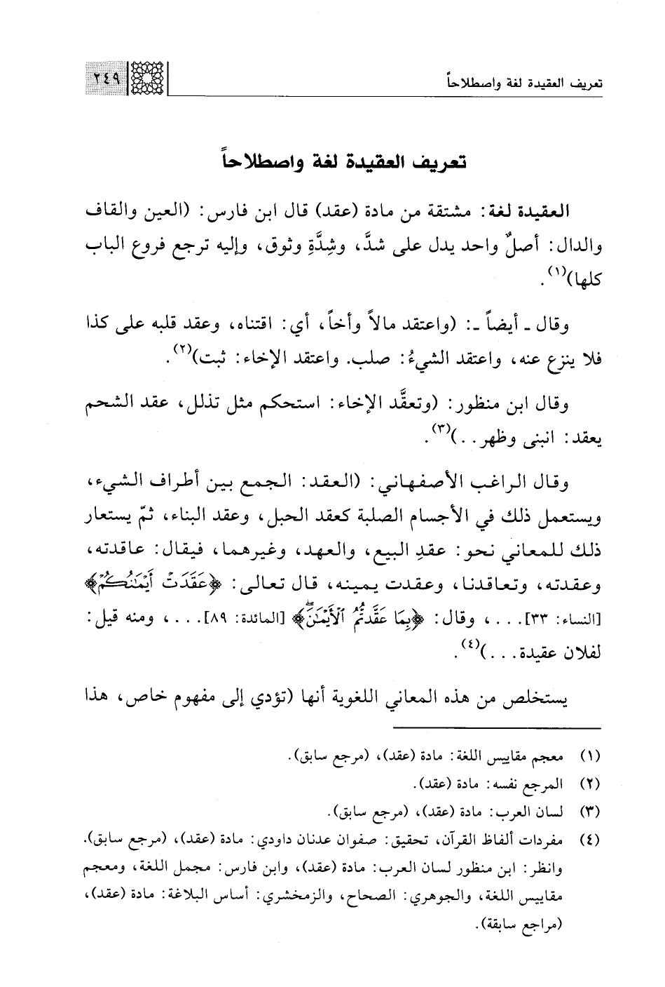 (¬4) مفردات ألفاظ القرآن، تحقيق: صفوان عدنان داودي: مادة (عقد)، (مرجع سابق). وانظر: ابن منظور لسان العرب: مادة (عقد)، وابن فارس: مجمل اللغة، ومعجم مقاييس اللغة، والجوهري: الصحاح، والزمخشري: أساس البلاغة: مادة (عقد)، (مراجع سابقة).