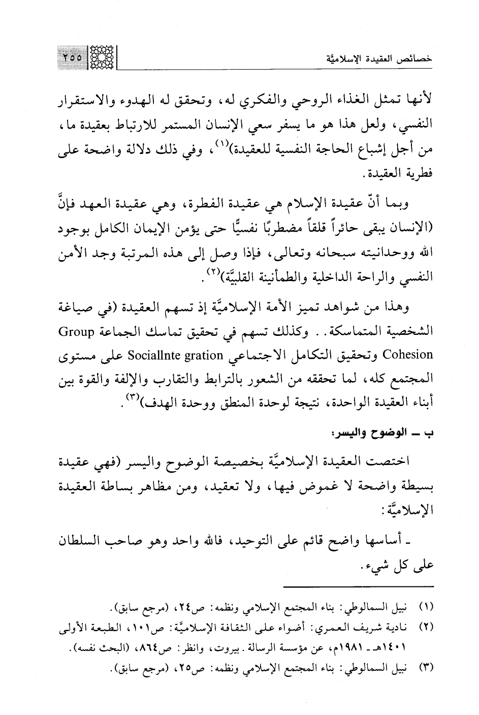 وهذا من شواهد تميُّز الأمة الإسلاميَّة إذ تسهم العقيدة (في صياغة الشخصية المتماسكة. . وكذلك تسهم في تحقيق تماسك الجماعة Group Cohesion وتحقيق التكامل الاجتماعي Sociallnte gration على مستوى المجتمع كله، لما تحققه من الشعور بالترابط والتقارب والإلفة والقوة بين أبناء العقيدة الواحدة، نتيجة لوحدة المنطق ووحدة الهدف) (¬3).