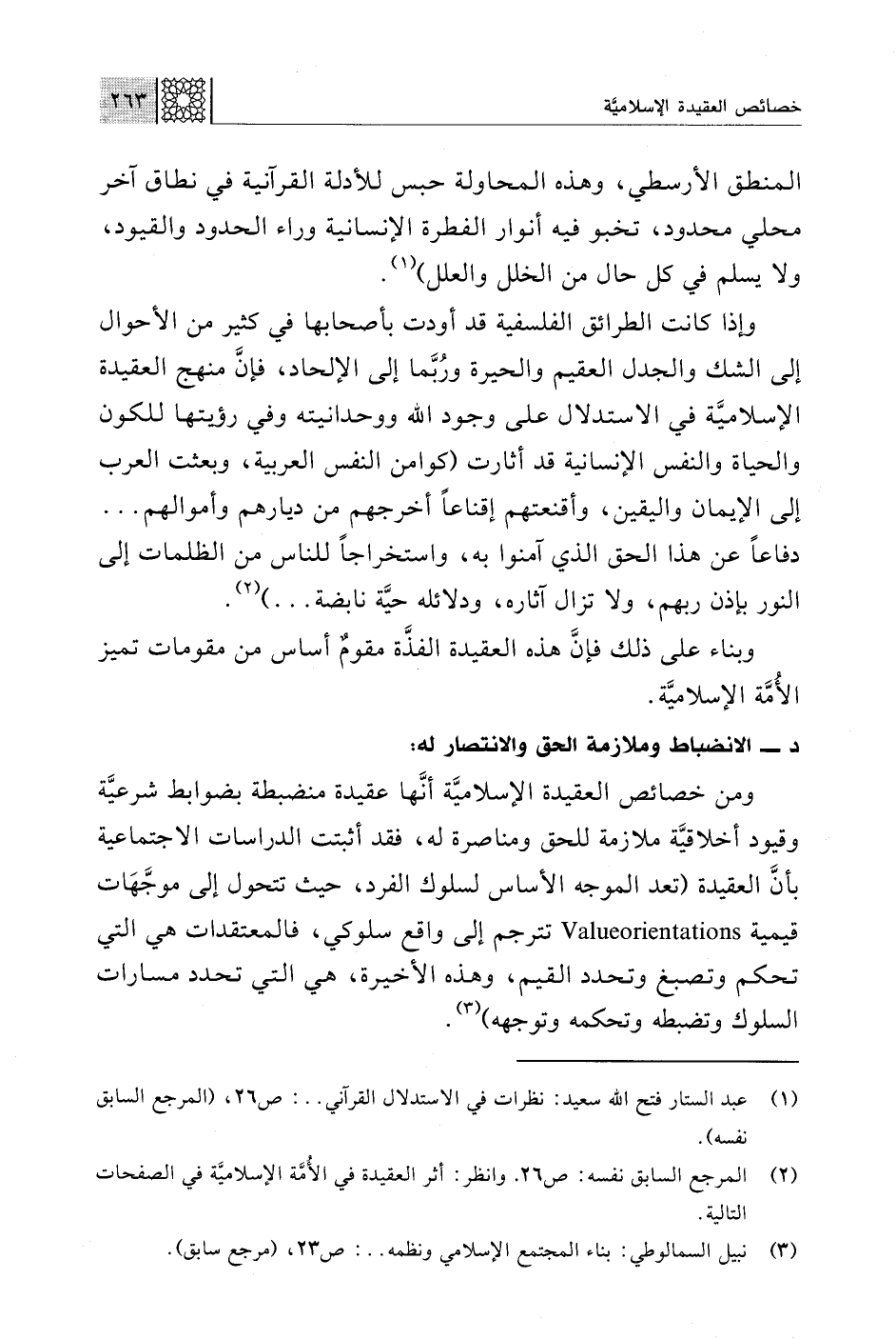 ومن خصائص العقيدة الإسلاميَّة أنَّها عقيدة منضبطة بضوابط شرعيَّة وقيود أخلاقيَّة ملازمة للحق ومناصرة له، فقد أثبتت الدراسات الاجتماعية بأنَّ العقيدة (تعد الموجه الأساس لسلوك الفرد، حيث تتحول إلى موجَّهَات قيمية Valueorientions تترجم إلى واقع سلوكي، فالمعتقدات هي التي تحكم وتصبغ وتحدد القيم، وهذه الأخيرة، هي التي تحدد مسارات السلوك وتضبطه وتحكمه وتوجهه) (¬3).