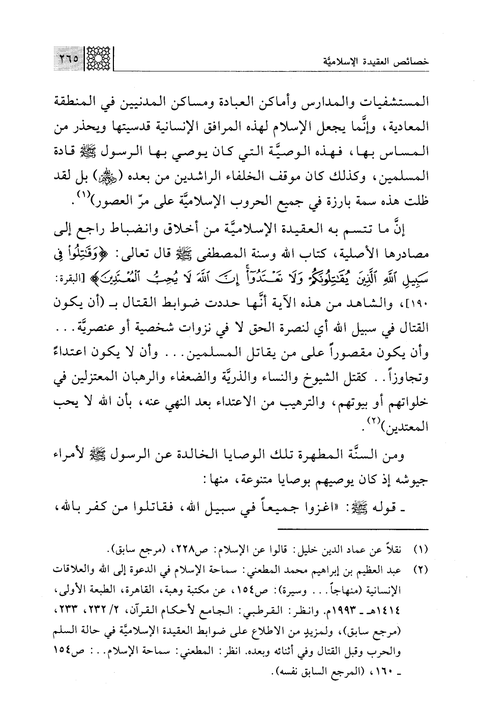(¬2) عبد العظيم بن إبراهيم محمد المطعني: سماحة الإسلام في الدعوة إلى اللَّه والعلاقات الإنسانية (منهاجًا. . . وسيرة): ص 154، عن مكتبة وهبة، القاهرة، الطبعة الأولى، 1414 هـ - 1993 م. وانظر: القرطبي: الجامع لأحكام القرآن، 2/ 232، 233، (مرجع سابق)، ولمزيدٍ من الاطلاع على ضوابط العقيدة الإسلاميَّة في حالة السلم والحرب وقبل القتال وفي أثنائه وبعده. انظر: المطعني: سماحة الإسلام. .: ص 154 - 160، (المرجع السابق نفسه).