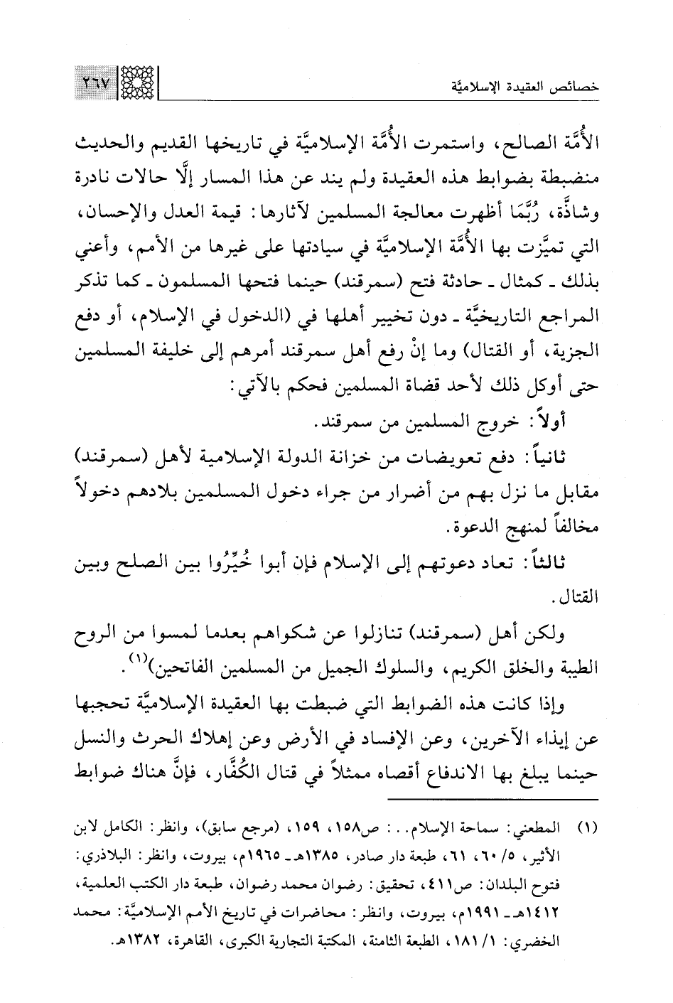 الأُمَّة الصالح، واستمرت الأُمَّة الإسلاميَّة في تاريخها القديم والحديث منضبطة بضوابط هذه العقيدة ولم يند عن هذا المسار إلَّا حالات نادرة وشاذَّة، رُبَّمَا أظهرت معالجة المسلمين لآثارها: قيمة العدل والإحسان، التي تميَّزت بها الأُمَّة الإسلاميَّة في سيادتها على غيرها من الأمم، وأعني بذلك -كمثال- حادثة فتح (سمرقند) حينما فتحها المسلمون -كما تذكر المراجع التاريخيَّة- دون تخيير أهلها في (الدخول في الإسلام، أو دفع الجزية، أو القتال) وما إنْ رفع أهل سمرقند أمرهم إلى خليفة المسلمين حتى أوكل ذلك لأحد قضاة المسلمين فحكم بالآتي: