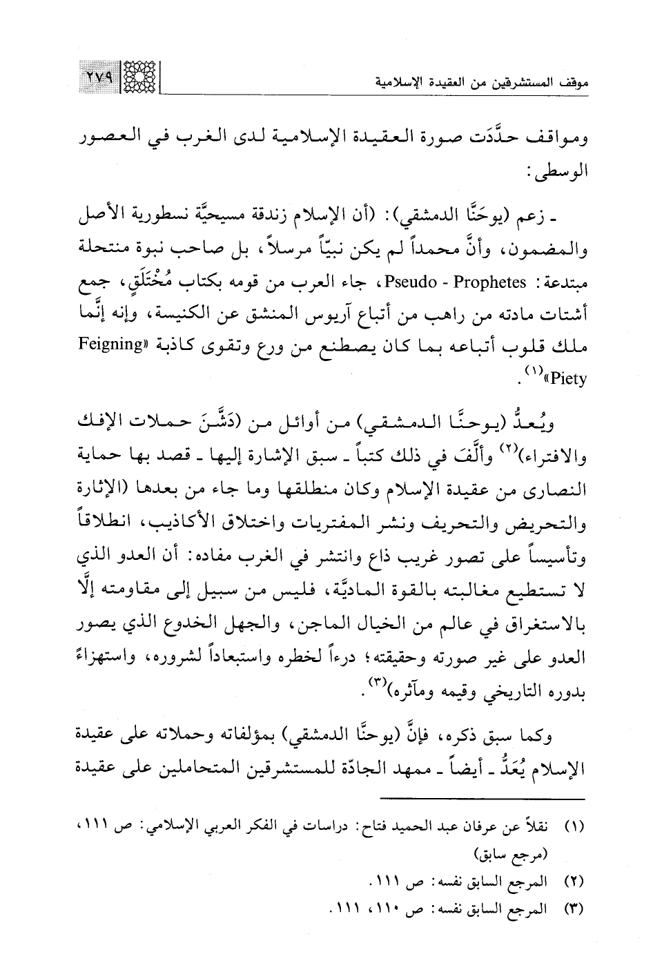 - زعم (يوحَنَّا الدمشقي): (أن الإسلام زندقة مسيحيَّة نسطورية الأصل والمضمون، وأنَّ محمدًا لم يكن نبيًّا مرسلًا، بل صاحب نبوة منتحلة مبتدعة: Pseudo - Prophentes جاء العرب من قومه بكتاب مُخْتَلَقٍ، جمع أشتات مادته من راهب من أتباع آريوس المنشق عن الكنيسة، وإنه إنَّما ملك قلوب أتباعه بما كان يصطنع من ورع وتقوى كاذبة " Feigning Piety " (¬1) .