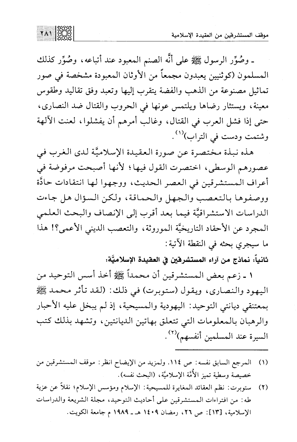 (¬2) ستوبرت: نظم العقائد المغايرة للمسيحية: الإسلام ومؤسس الإسلام؛ نقلًا عن عزية طه: من افتراءات المستشرقين على أحاديث التوحيد، مجلة الشريعة والدراسات الإسلامية، [13]: ص 26، رمضان 1459 هـ - 1989 م جامعة الكويت.