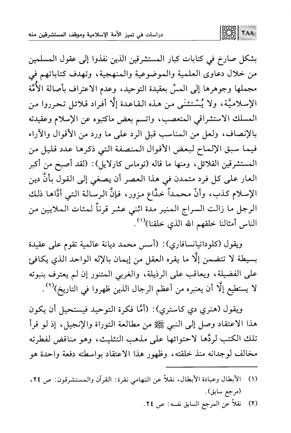 بشكل صارخ في كتابات كبار المستشرقين الذين نفذوا إلى عقول المسلمين من خلال دعاوى العلمية والموضوعية والمنهجية، وتهدف كتاباتهم في مجملها وجوهرها إلى المسِّ بعقيدة التوحيد، وعدم الاعتراف بأصالة الأُمَّة الإسلاميَّة، ولا يُسْتثنَى من هذه القاعدة إلَّا أفراد قلائل تحرروا من المسلك الاستشراقي المتعصب، واتسم بعض ما كتبوه عن الإسلام وعقيدته بالإنصاف، ولعل من المناسب قبل الرد على ما ورد من الأقوال والآراء فيما سبق الإلماح لبعض الأقوال المنصفة التي ذكرها عدد قليل من المستشرقين القلائل، ومنها ما قاله (توماس كارلايل): القد أصبح من أكبر العار على كل فرد متمدن في هذا العصر أن يصغي إلى القول بأنَّ دين الإسلام كذب، وأنّ محمدًا خدَّاع مزور، فإنَّ الرسالة التي أدَّاها ذلك الرجل ما زالت السراج المنير مدة اثني عشر قرنًا لمئات الملايين من الناس أمثالنا خلقهم اللَّه الذي خلقنا) (¬1).