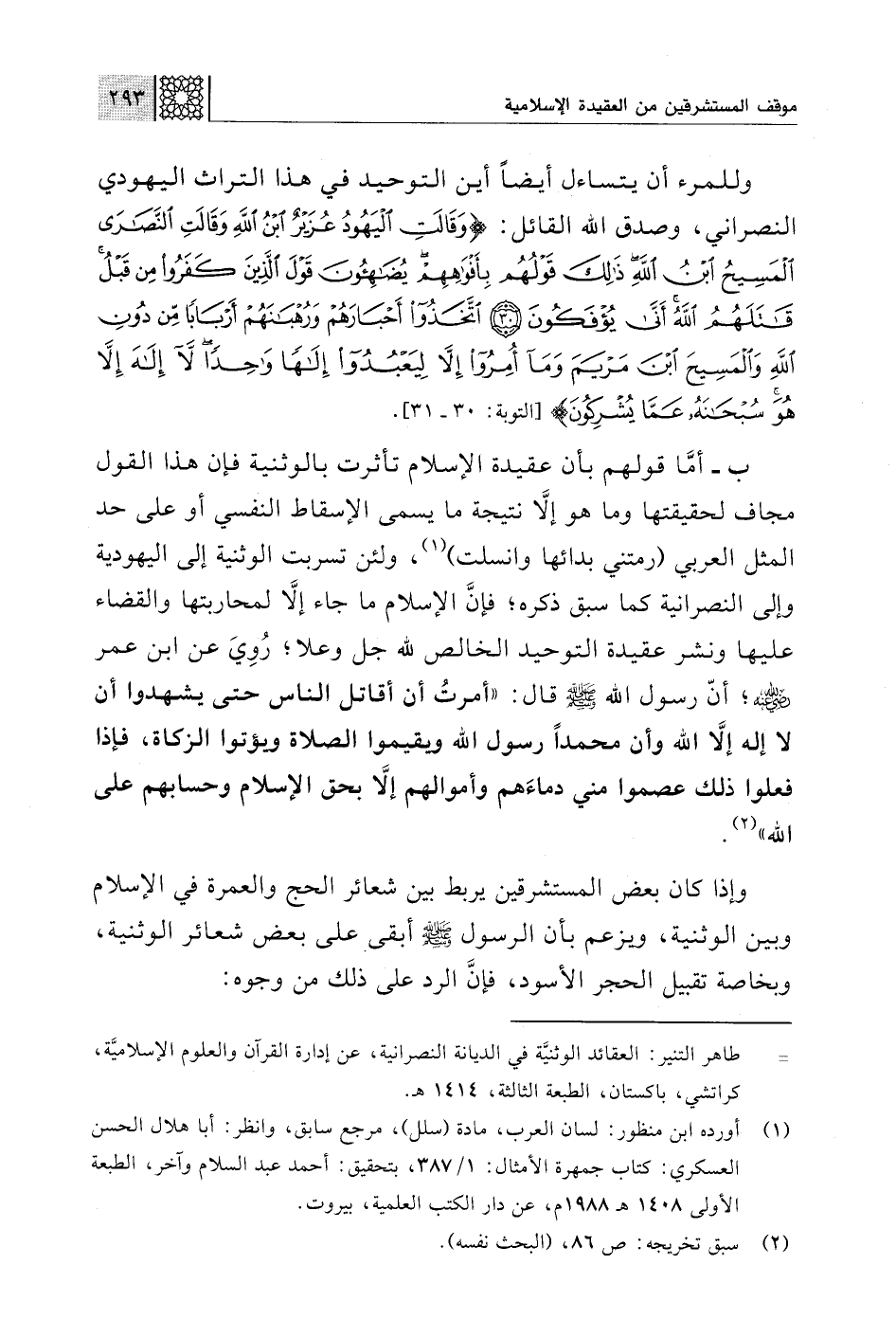 وللمرء أن يتساءل أيضًا أين التوحيد في هذا التراث اليهودي النصراني، وصدق اللَّه القائل: {وَقَالَتِ الْيَهُودُ عُزَيْرٌ ابْنُ اللَّهِ وَقَالَتِ النَّصَارَى الْمَسِيحُ ابْنُ اللَّهِ ذَلِكَ قَوْلُهُمْ بِأَفْوَاهِهِمْ يُضَاهِئُونَ قَوْلَ الَّذِينَ كَفَرُوا مِنْ قَبْلُ قَاتَلَهُمُ اللَّهُ أَنَّى يُؤْفَكُونَ (30) اتَّخَذُوا أَحْبَارَهُمْ وَرُهْبَانَهُمْ أَرْبَابًا مِنْ دُونِ اللَّهِ وَالْمَسِيحَ ابْنَ مَرْيَمَ وَمَا أُمِرُوا إِلَّا لِيَعْبُدُوا إِلَهًا وَاحِدًا لَا إِلَهَ إِلَّا هُوَ سُبْحَانَهُ عَمَّا يُشْرِكُونَ} [التوبة: 30 - 31].